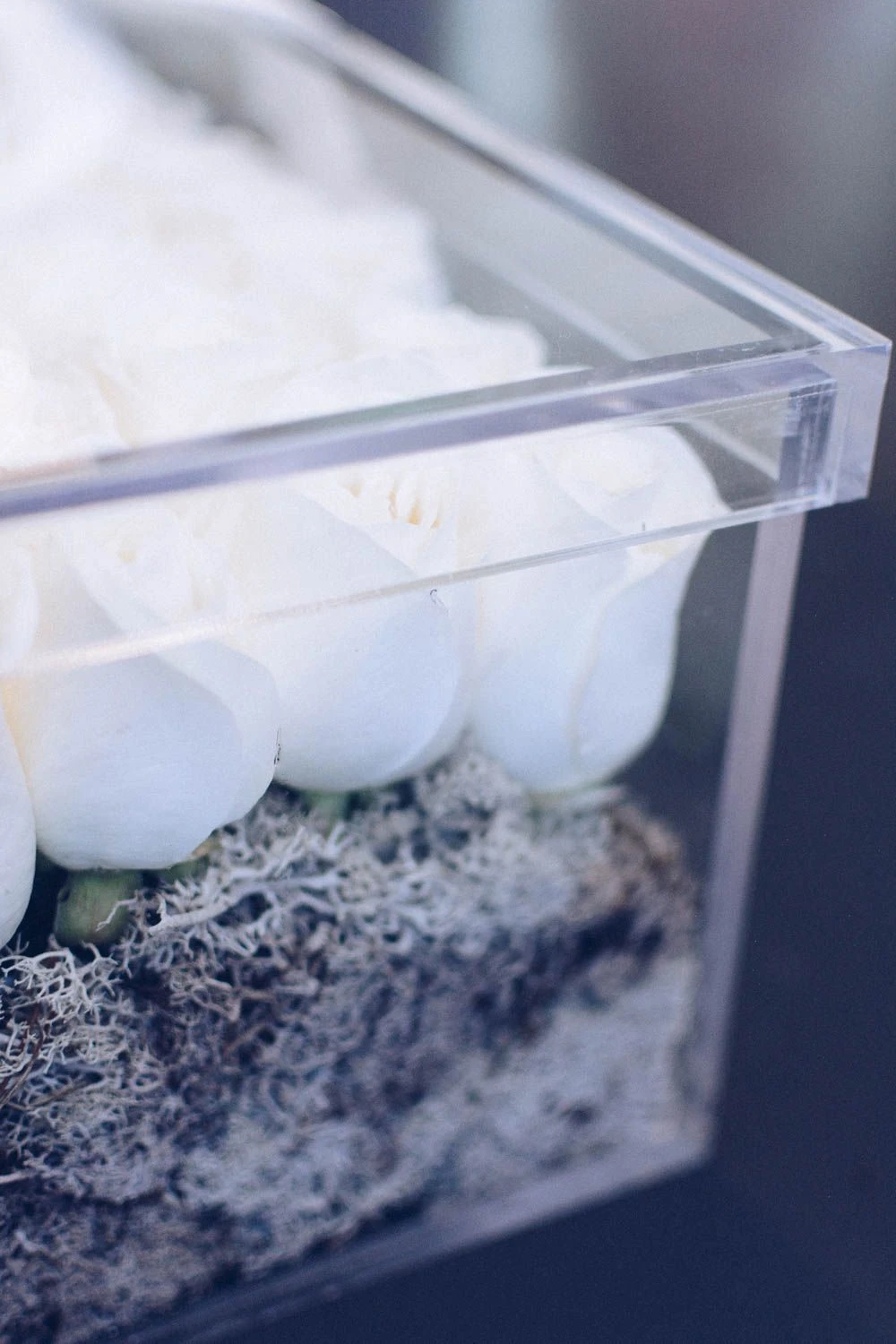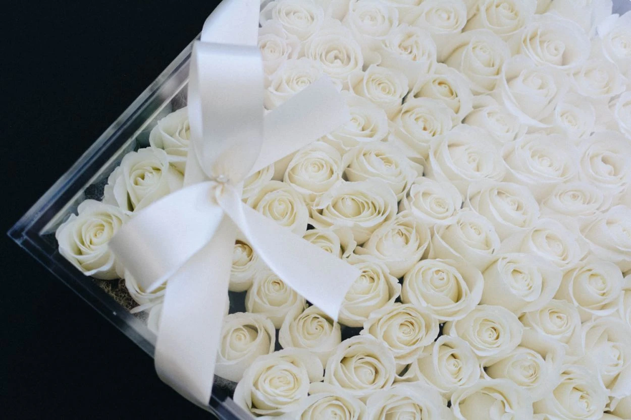 This modern new design is dripping in timeless elegance, and effortlessly captures 100 ways to say “I Love You.” 100 pristine ivory roses, as fragrant as they are stunning, rest atop a bed of silver moss, all contained within a 14″ x 14″ contemporary plexiglass box complete with lid for easy gifting.