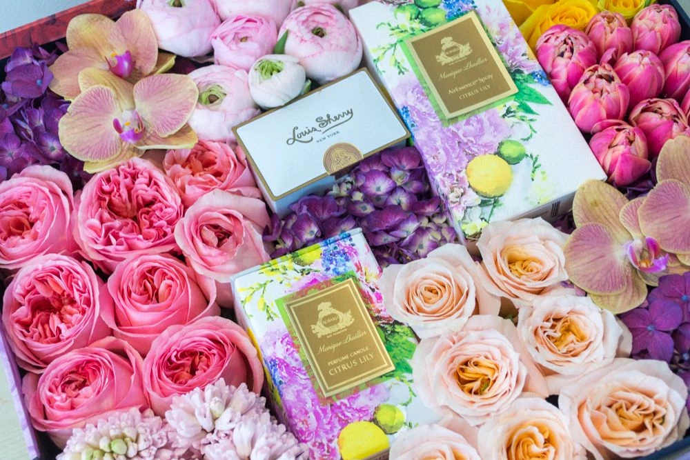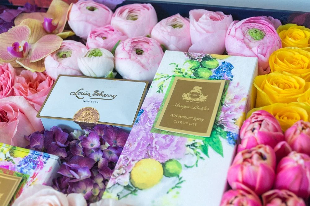 Share your emotions, share your joy with this perfectly giftable floral box! This beautiful spring mix includes fragrant pink garden roses, purple hydrangea, sunshine yellow roses, local lilac, and pink tulips. A Louis Sherry chocolate tin, Monique Lhuillier room spray, and a Monique Lhuillier scented candle add an extra touch of luxury. Blooms rest within a 16” by 16” custom watercolor rose print box, complete with lid.