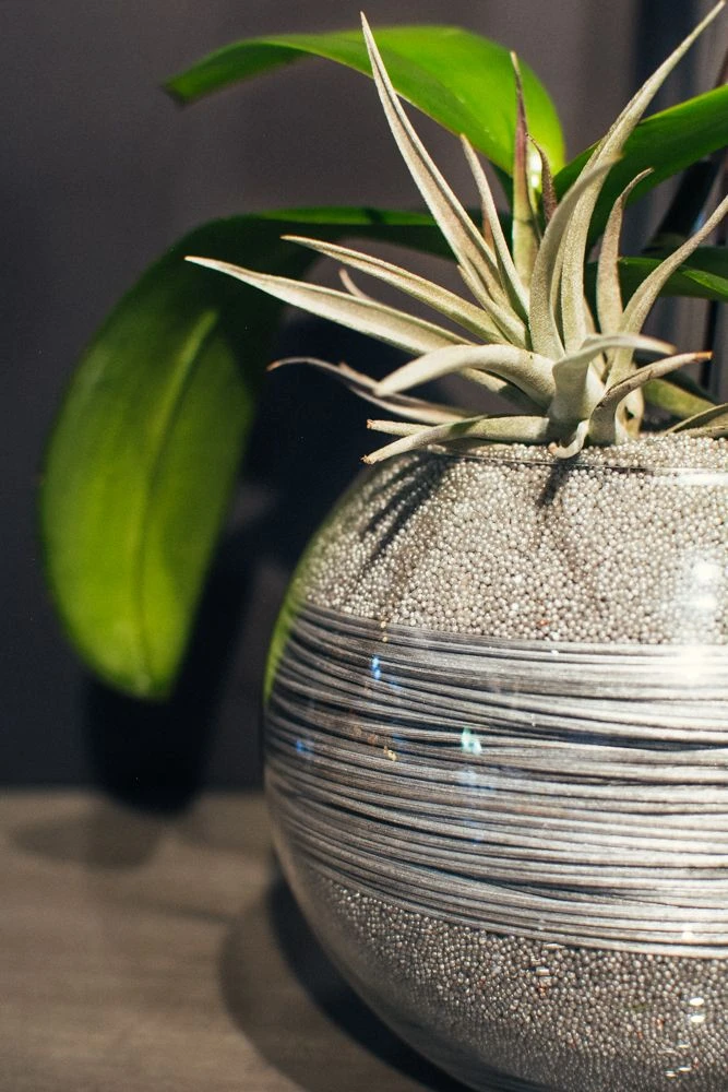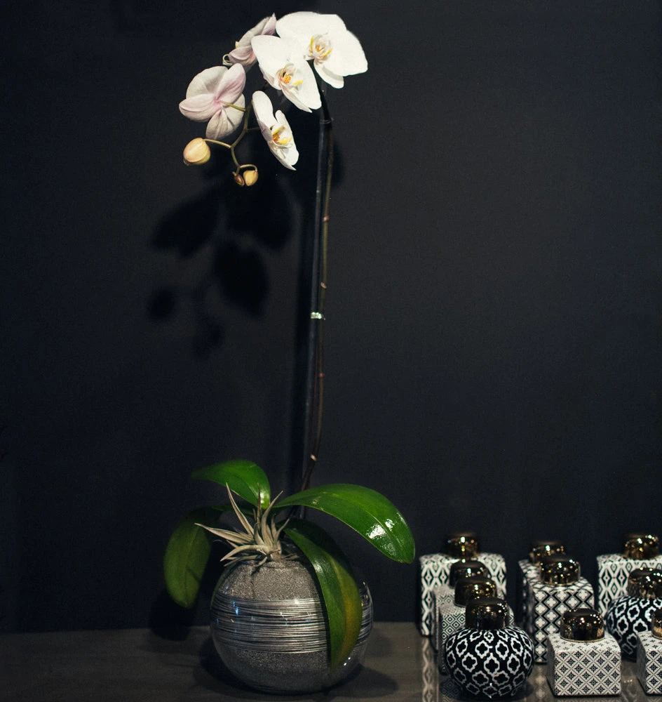 A single phalaenopsis stem rests within a 6″ tall circular vase, filled to the brim with layers of metallic silver sand and metallic silver middolino finished with the perfect accent of a tillandsia air plant. Orchid picured stands at 25″ tall, with the arrangement standing at approximately 31″ tall overall. Please note that orchid stems will vary in height.