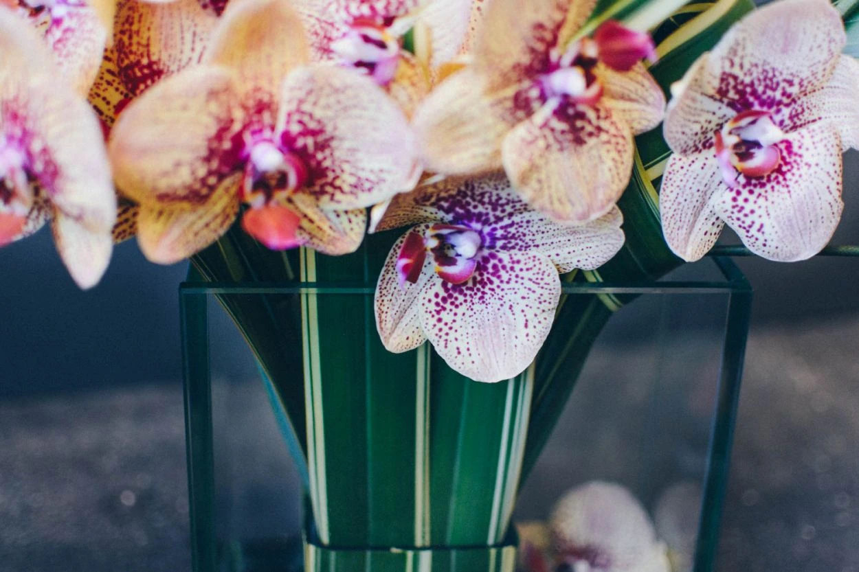 Contemporary and fresh, this stunning new design is sure to take your breath away. Two-toned phalaenopsis stems create a structural masterpiece amongst knotted flax leaves that can be seen submerged within the 11″ by 11″ glass vase. Overall, this arrangement stands at approximately 18″ tall and 20″ wide.