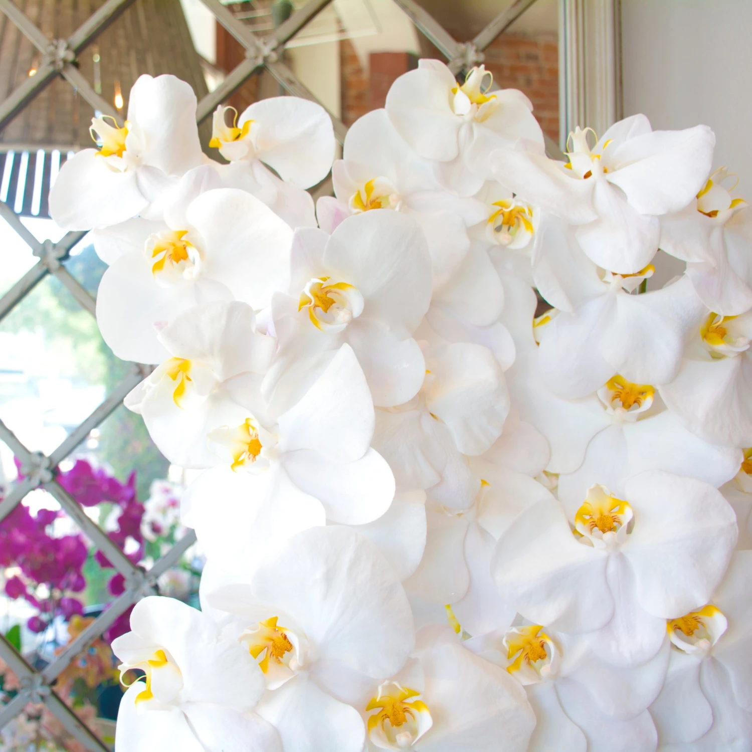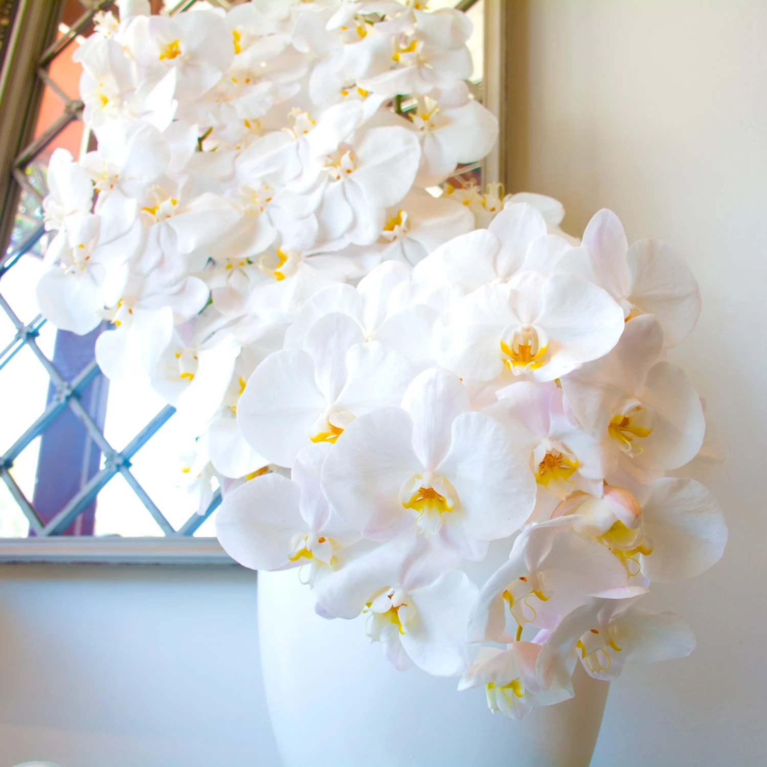 A Waterfall of Orchids is a larger than life asymmetrical arrangement with 12 stems of stunning White Orchids backed by large green leaves. The arrangement is striking in size and shape with delicate details of yellow at the center column of the flower. Erupting from a 12″ by 12″ modern vase (wide from the front narrow from the side view) this arrangement stands at 33″ by 21″.Ā This spectacle will wow anyone and create a stunning center piece for any room.