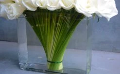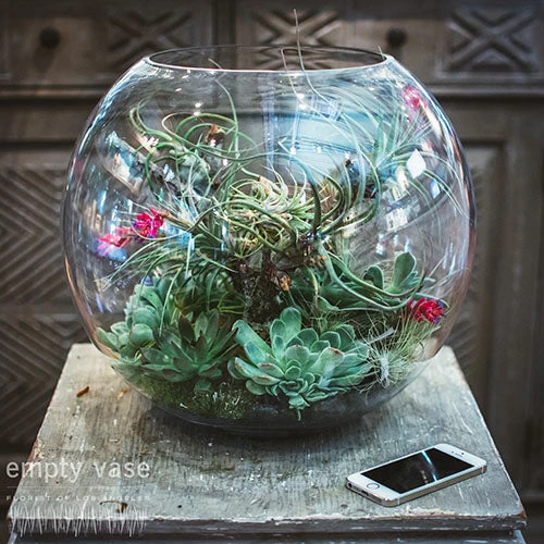 This terrarium features a lush, exotic array of succulents and air plants skillfully arranged in a 14” round glass fish bowl. Beneath the plants is a base composed of smooth black river rocks and moss. Known for their hardy longevity and low maintenance, succulents and air plants will complement any décor!
