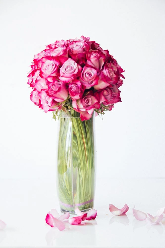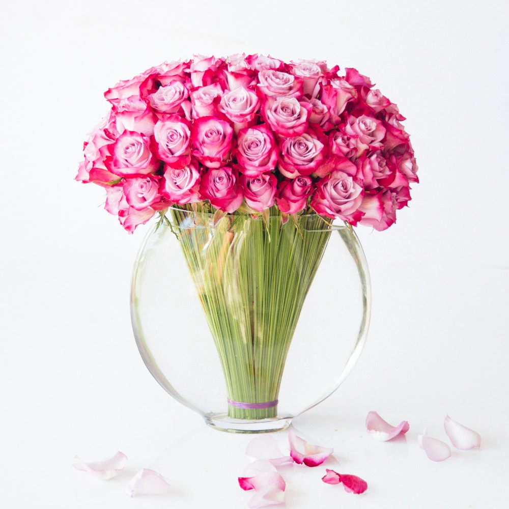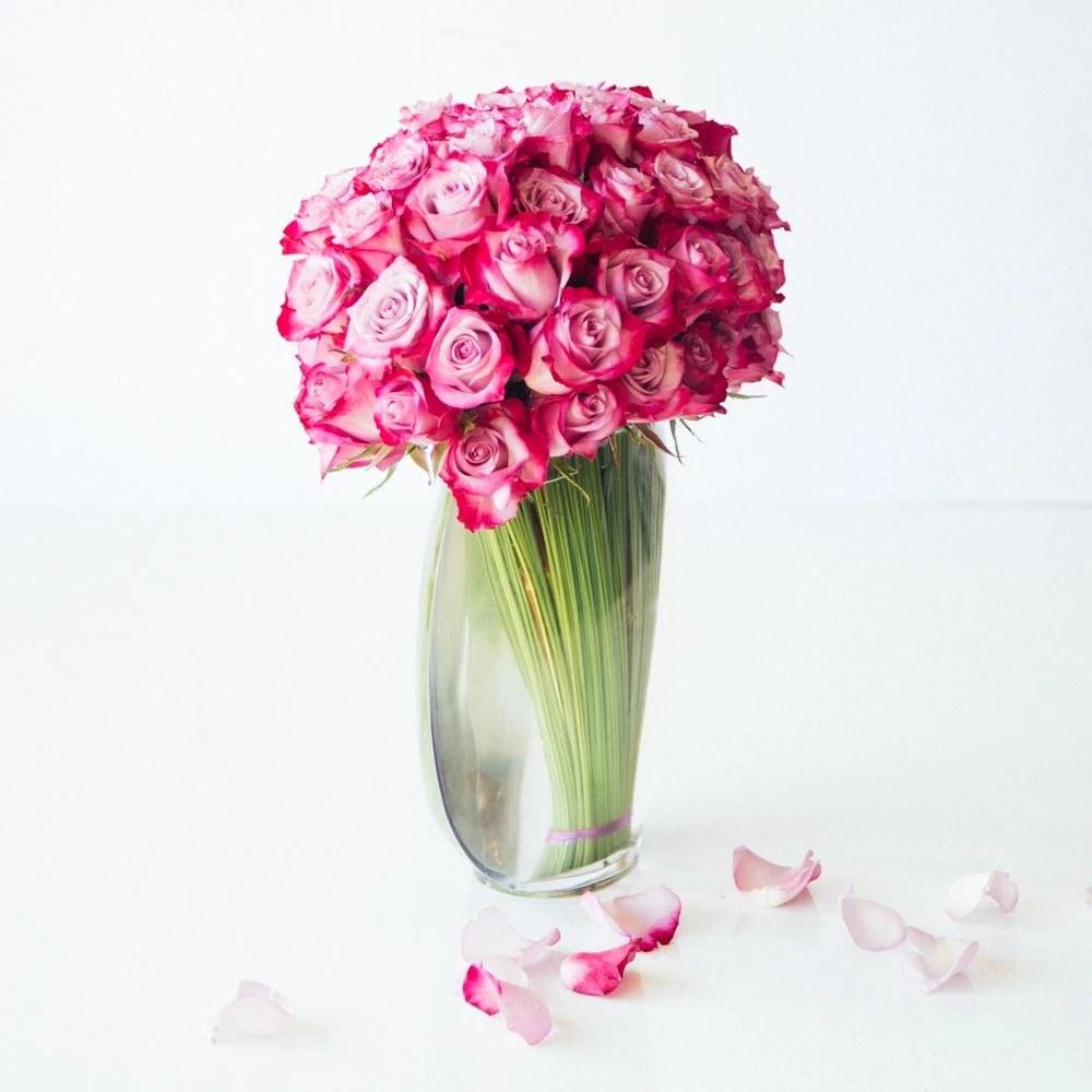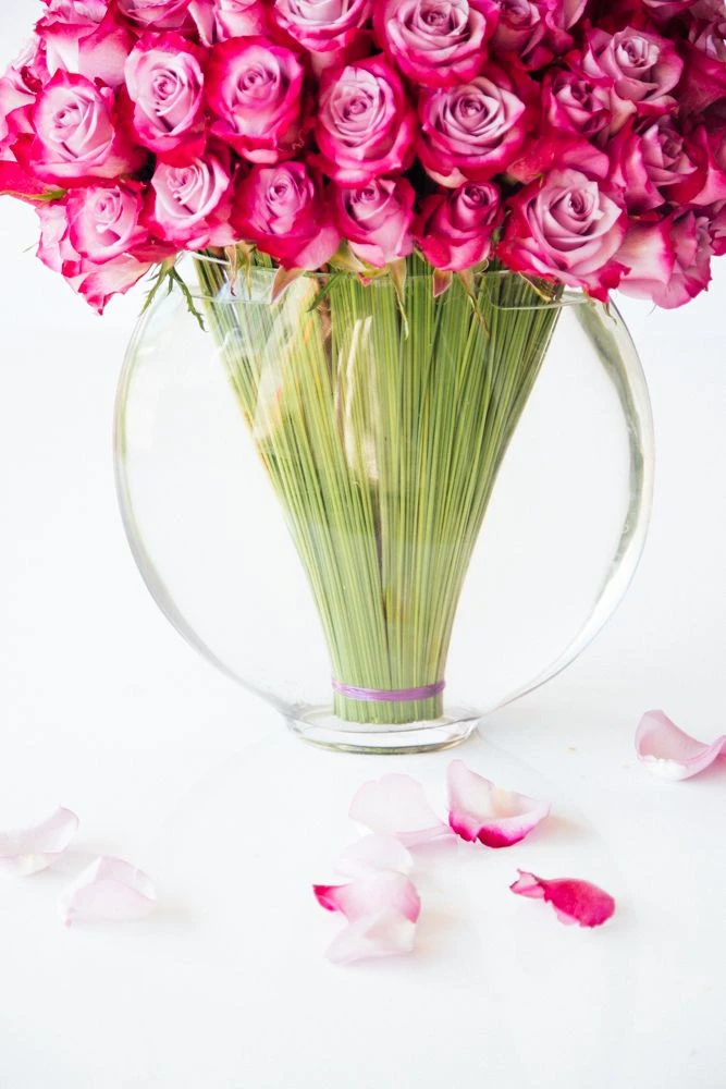 This stunning floral design is offers a classic and modern take on romance. Up to SEVENTY-FIVE deep purple roses are gathered together, with steel grass covering the stems and shaping into a “V-shape”. Resting inside a 10 inch tall glass vase, overall this arrangement stands around 16 inches tall.