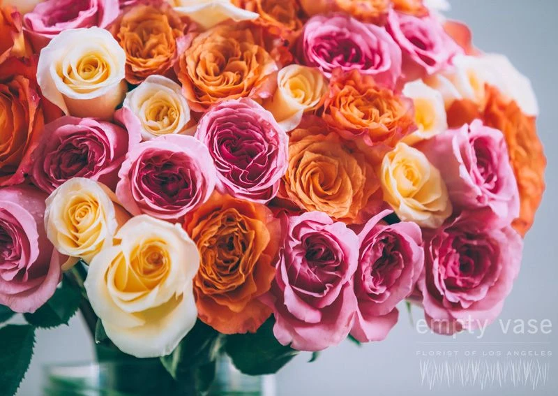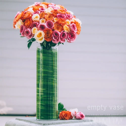 With it’s bright, playful array of SEVENTY FIVE pink, orange, and yellow roses, this arrangement evokes the joy of spring time! Resting in a 20 inch by 6 inch cylindrical glass vase lined with decorative grass, this arrangement is approx. 32 inches tall.