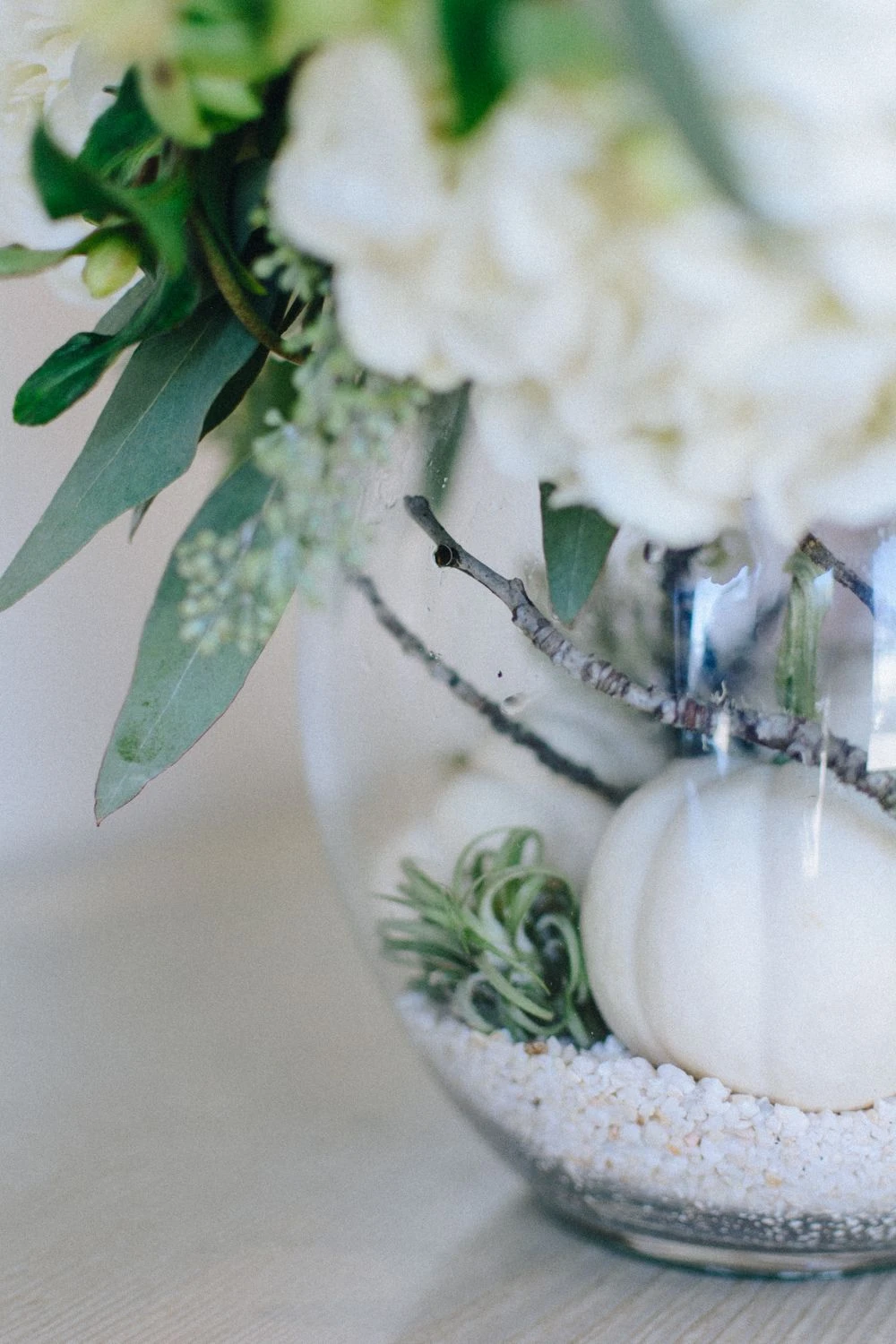 Inside the 8″ tall glass vase, you’ll discover a captivating scene featuring additional white miniature pumpkins, air plants, and gracefully twining branches. This remarkable arrangement stands at approximately 18″ in height, making it a striking centerpiece for any occasion.