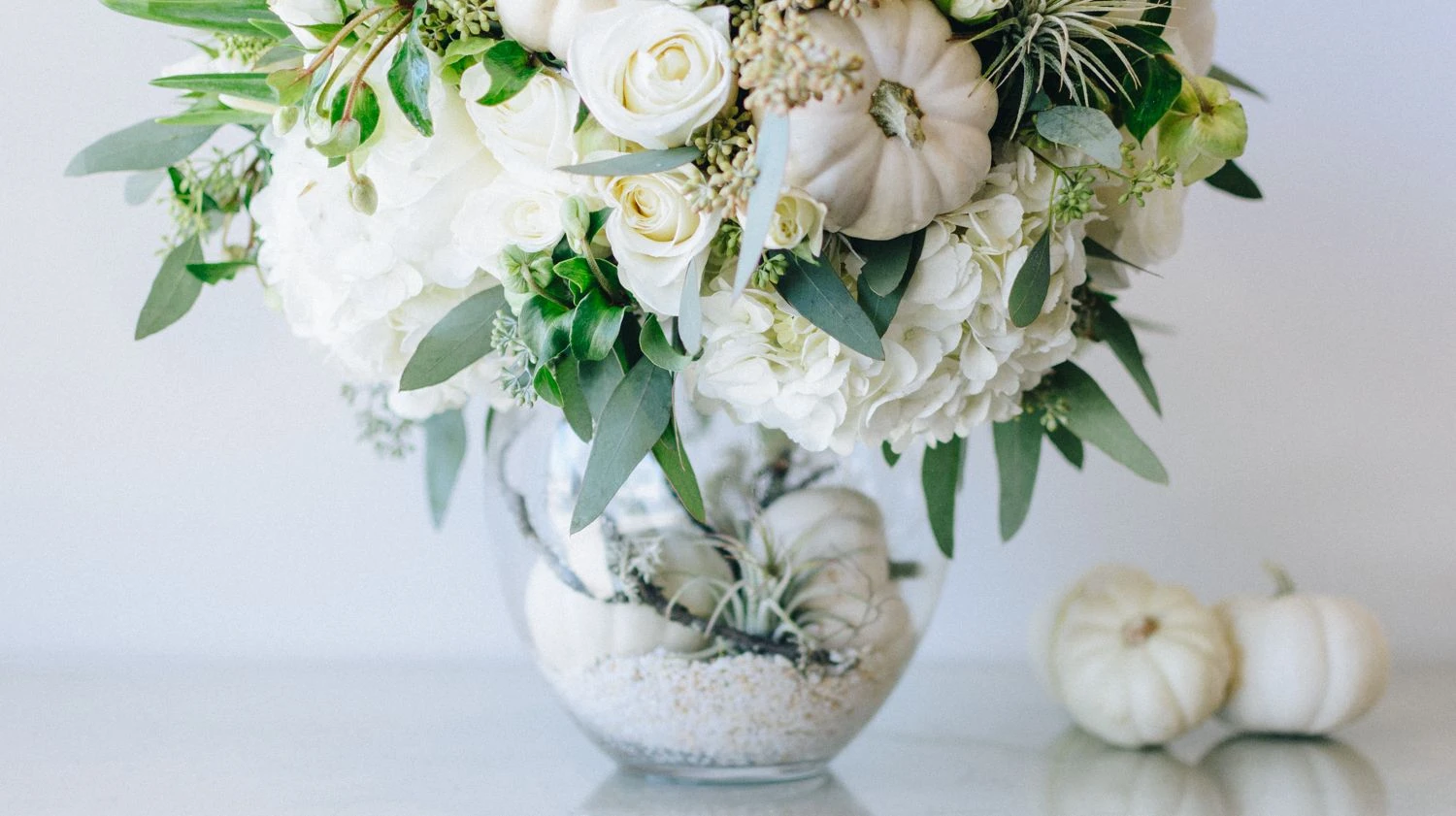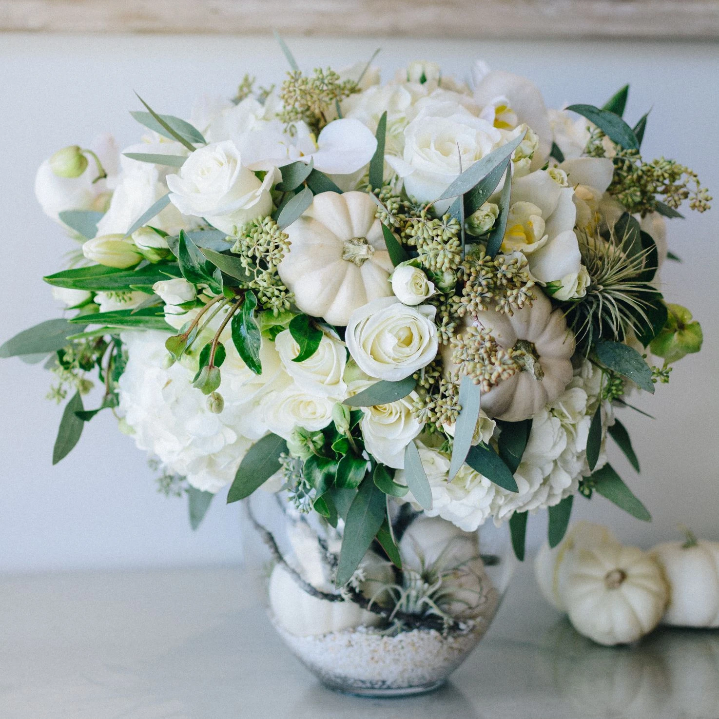 Experience the enchantment of our captivating two-piece floral arrangement! Immerse yourself in the beauty of pristine white roses, delicate tillandsia air plants, elegant white hydrangea, and exquisite white phalaenopsis orchids, which come together to form a lush and dreamy cloud of floral artistry. To add a subtle touch of festivity, we’ve included white pumpkins that perfectly complement the arrangement.