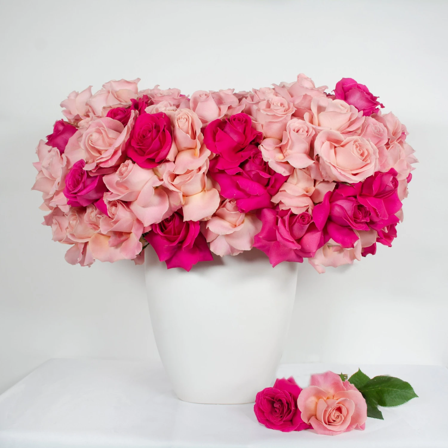 A bursting field of One Hundred light and dark pink roses! Blooming love is a combination of fragrant hermosa roses with vibrant pink floyd roses speckled throughout. This luscious arrangement sits at a grand 21 inches tall and 26 inches wide in a contemporary white ceramic vase.