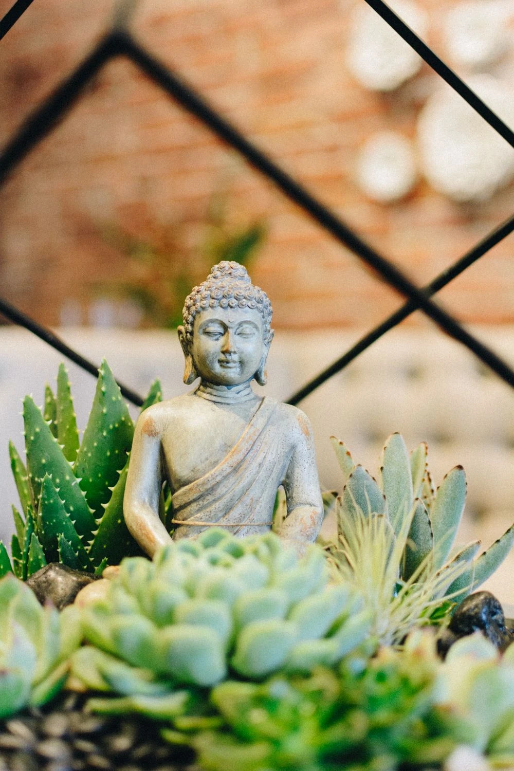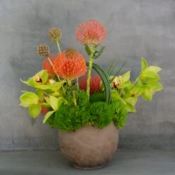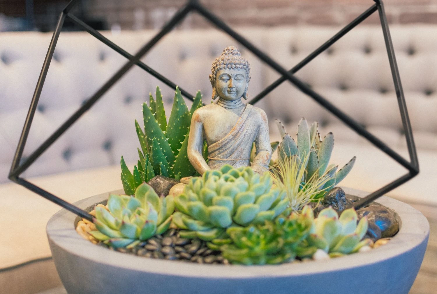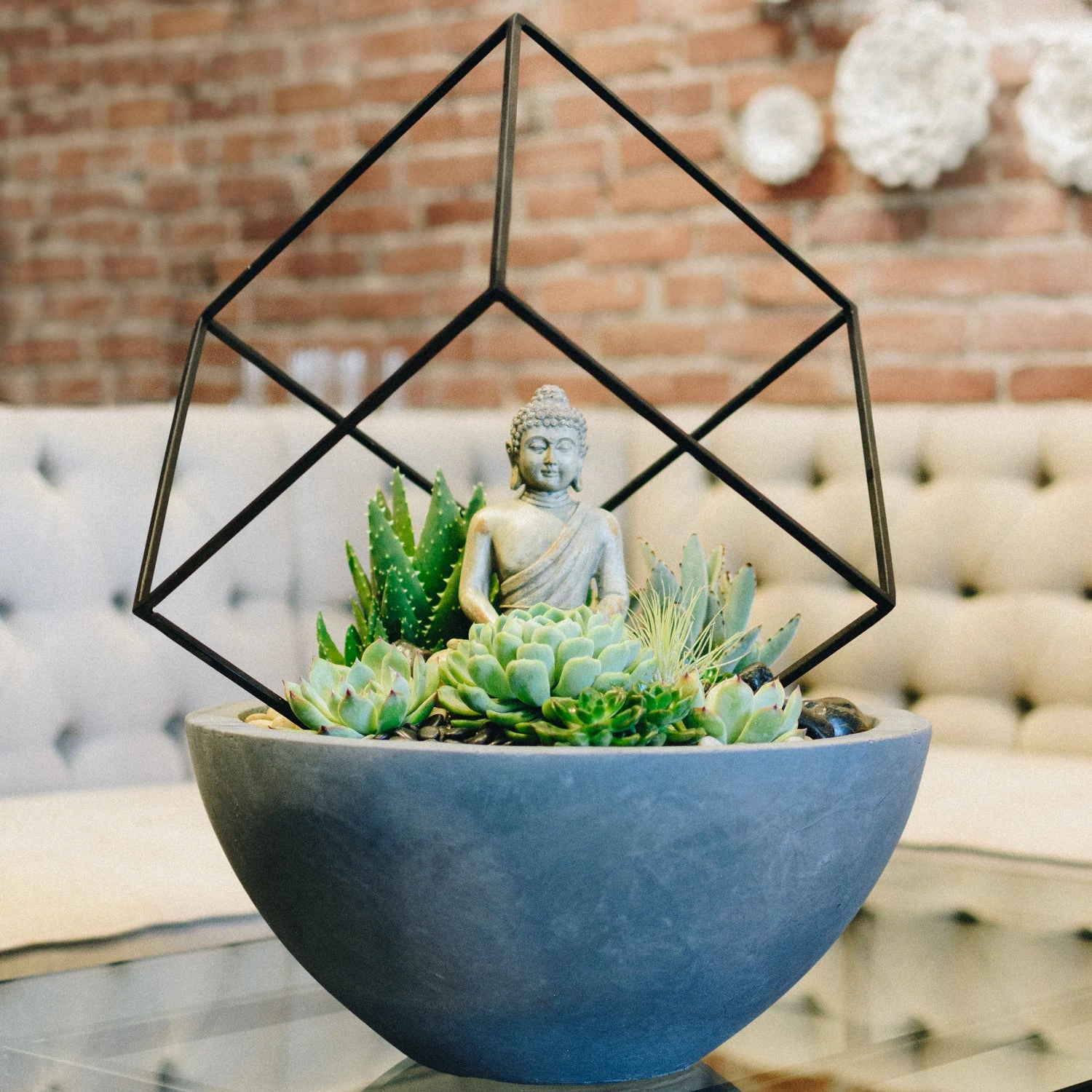 This stunning new design offers a moment of ultimate relaxation and zen. An antique finish 8″ tall Buddha sits in peace amongst a vibrant selection of hand-selected succulents, as if meditating in his own personal garden. All succulents are planted and thriving atop a 17″ wide by 8″ tall contemporary charcoal grey vase, while a bold geometric metal cube further modernizes this classic design. This breathtaking arrangement stands at approximately 24″ tall overall. Please note that succulent variety may differ based upon availability.