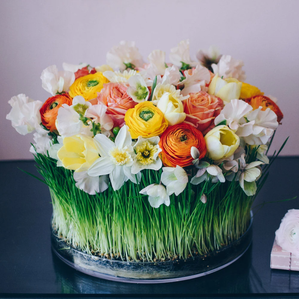 Welcome spring with this magical fairy design. Soft blush sweet peas flutter, as dainty and delicate as butterflies, above a grove of peach garden roses, pale yellow tulips, cream daffodils, and vibrant ranunculus. This stunning arrangement is built to appear as though the lush bouquet had been “growing” atop a bed of wheat grass, all resting within a 1.5″ by 12″ low cylinder vase.