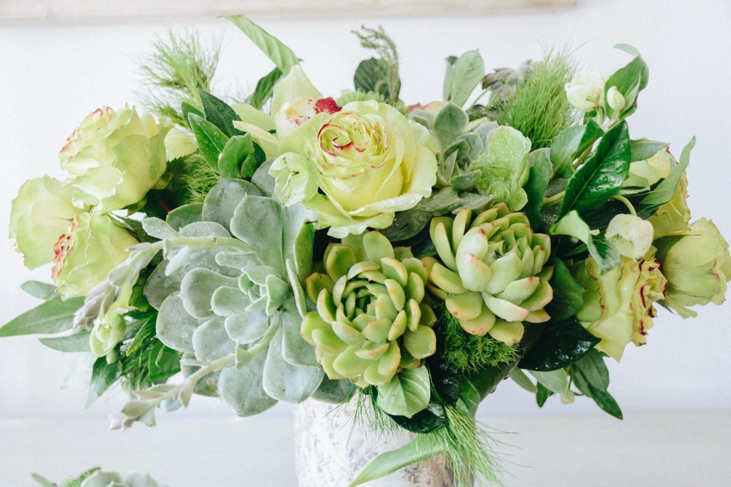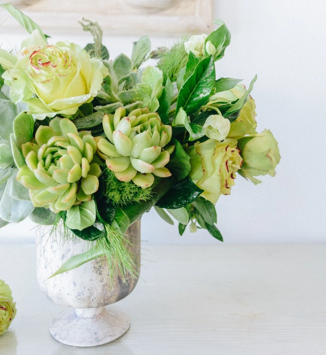 Crisp chartreuse colored florals create a fresh cloud of hand-selected succulents, orchids, winter roses, and wild greenery. Resting inside an 8” tall rustic mercury vase, overall this arrangement stands around 15” tall.