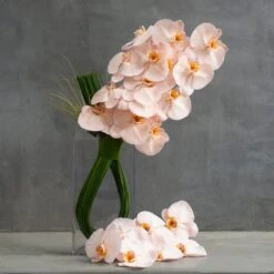 Enhance your floral experience with our stunning yet simple floral arrangement showcasing captivating mocha-colored phalaenopsis orchids. Brilliant green steel grass elegantly intertwines, providing support to the exquisite orchid blooms, all within an 8-inch rectangular glass vase. This impressive arrangement reaches a height of 14 inches, making it a true showstopper.
