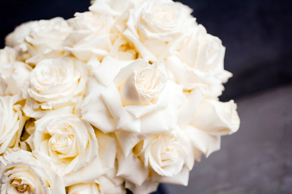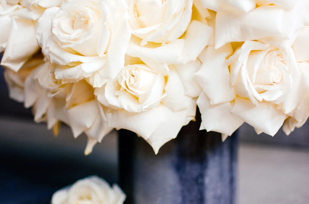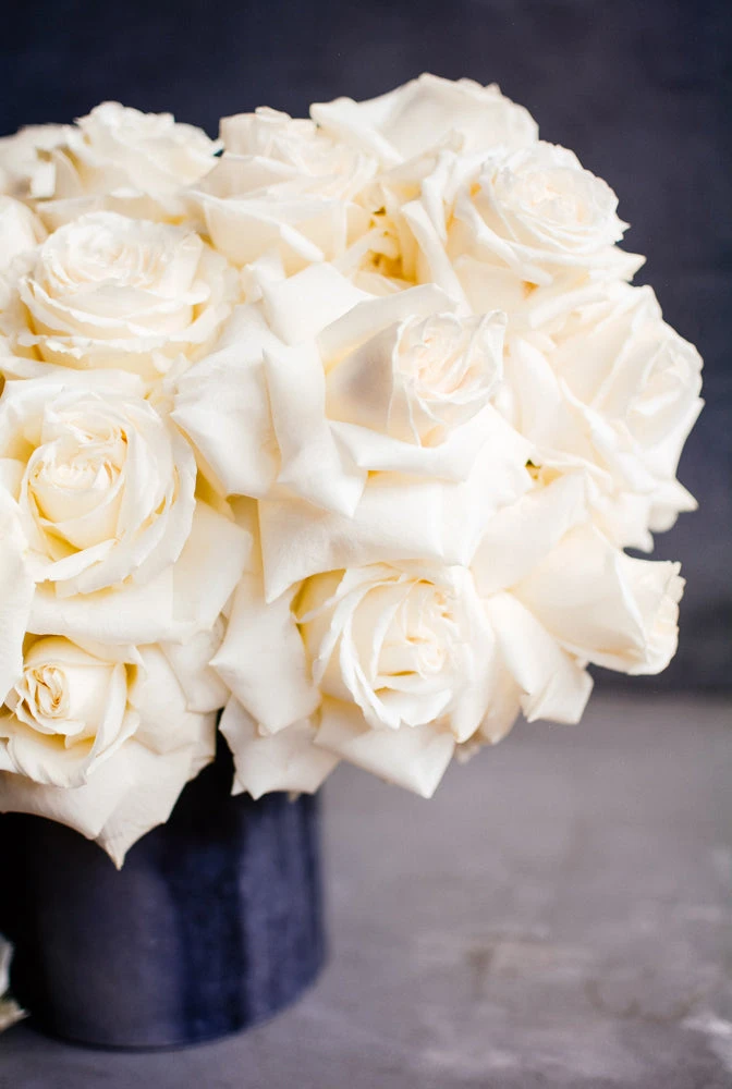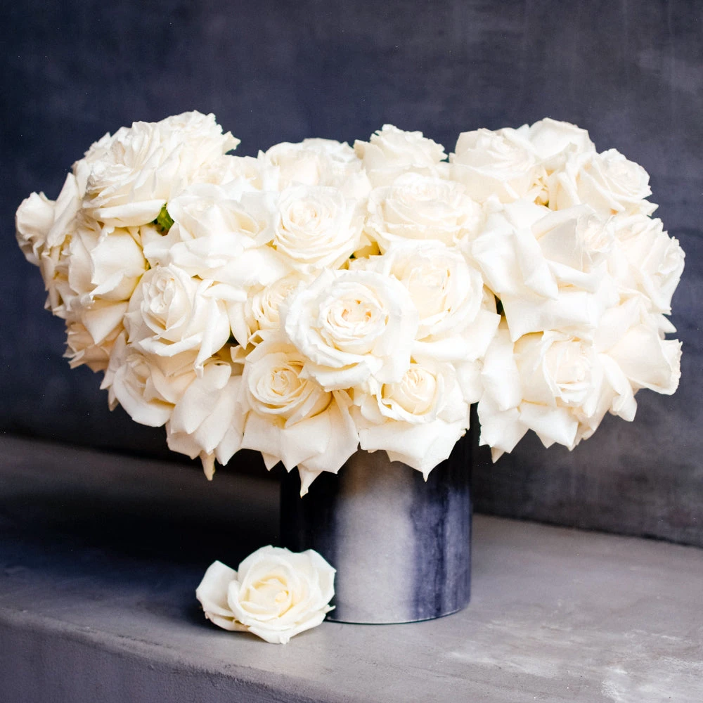 “Cloud Nine” features 50-55 stems of perfectly ruffled and reflexed white playa blanca roses. These breathtaking blooms form a delicate in-and-out asymmetrical cloud, floating high atop a 7″ x 7″ black and white marble vase.Â