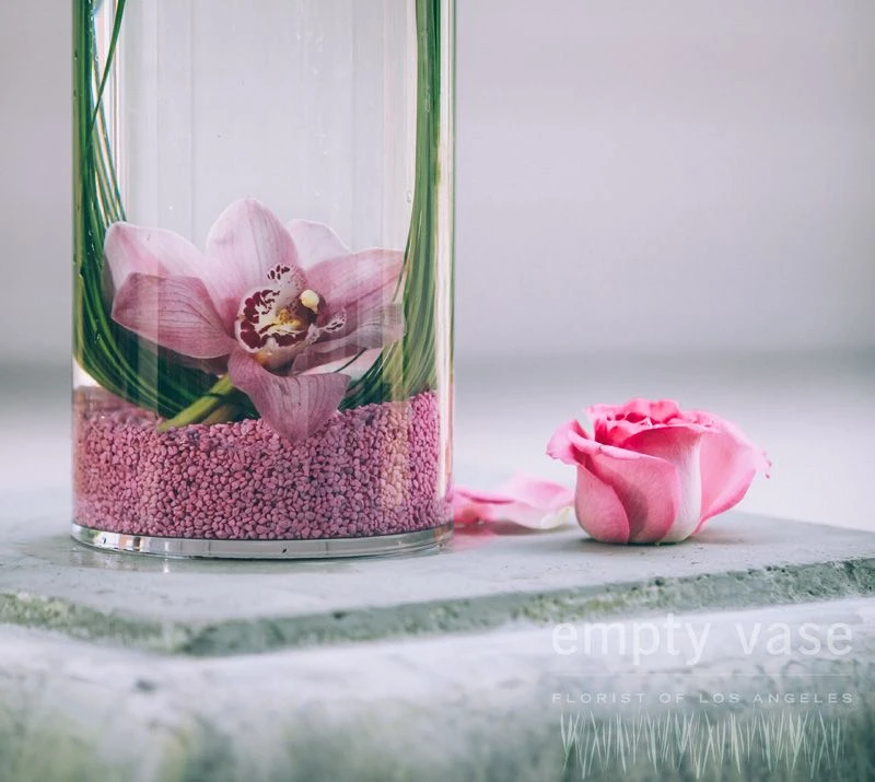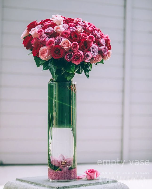 The sweet, candy-like hues of 75 red, hot pink, peach, and light purple roses come together to create this decadent arrangement! At approx. 28” tall, it rests in a 20”x6” cylindrical glass vase that is partly lined with ti leaves and middolina wire with decorative pink gravel and a single pink cymbidium orchid lining the base. This stunning arrangement is available in different sizes upon request. Please call for all custom orders.