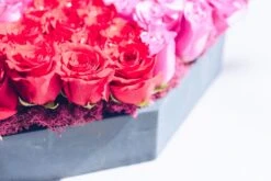 This visual masterpiece appears as if overflowing with 25 vibrant peonies in full bloom. Coral charm peonies feature deep coral buds that blossom out to large semi-double flowers with a slightly sweet fragrance. Accompanied by an abundance of silvery gray dusty miller foliage, the contrast is striking. Green steel grass twines, visibly submerged within the 8″ tall circular glass vase. This breathtaking design stands at approximately 16″ tall and 19″ wide overall.