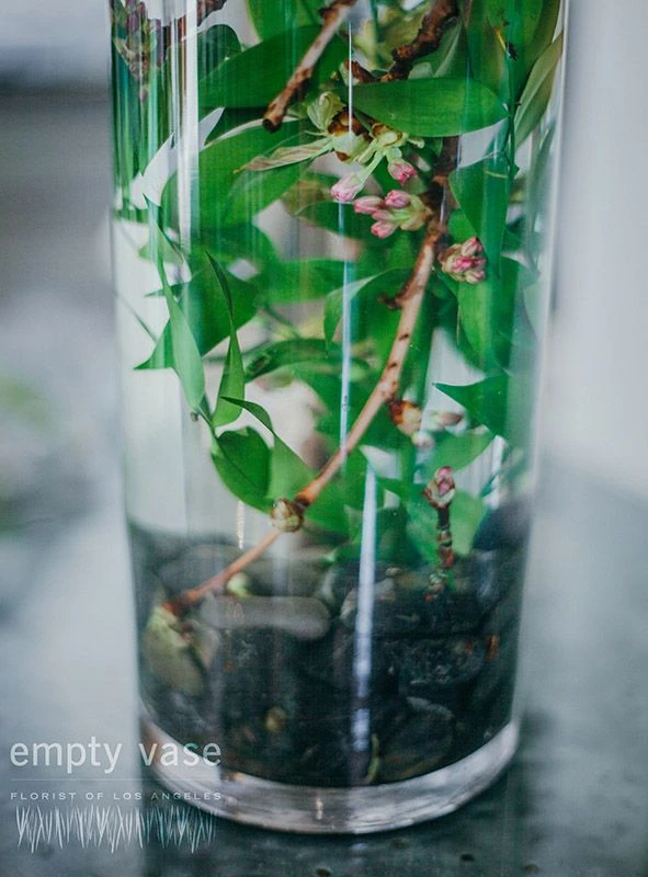 This stunning arrangement consists of 20 vibrant coral peonies paired with delicate cherry blossoms. The lovely blooms are contrasted by lush gardenia leaves and monstera leaves perched atop a tall 19” glass cylinder vase containing smooth river rocks. This arrangement measures approx. 35” tall.