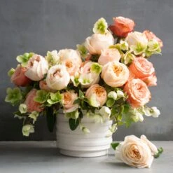 Our classic asymmetrical design features a beautiful and dreamy arrangement with an ombre effect of peachy princess crown roses, luscious cream expression roses, and a touch of green winter roses to bring the arrangement together. Camellia leaves provide a backdrop for the flowers, which rest in an intricate, textured white vase measuring 15.5 inches in height and 17 inches in width.
