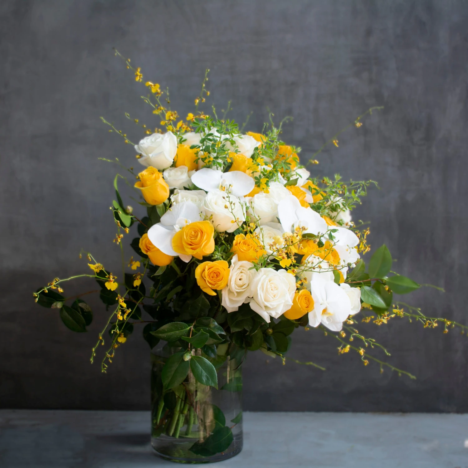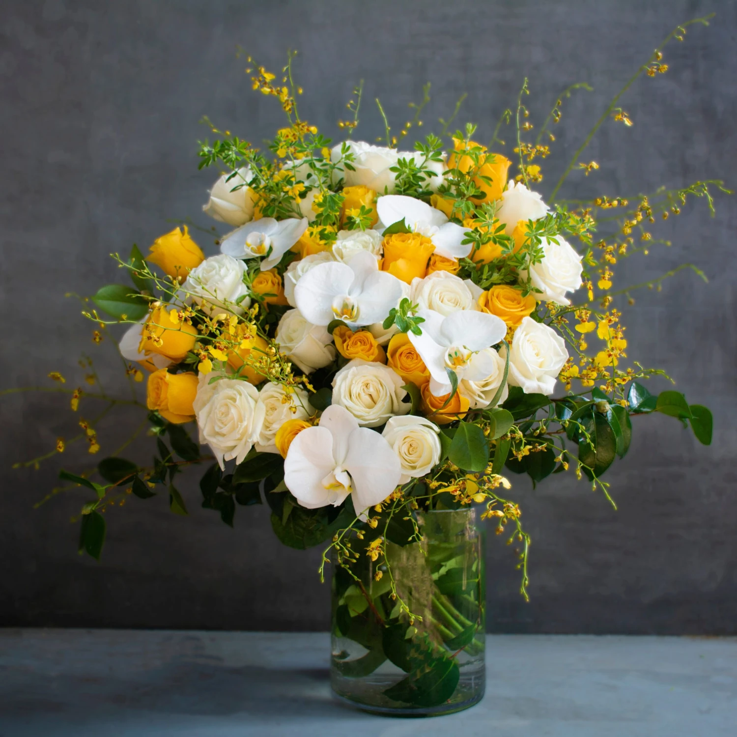This bright and fresh arrangement is an original Empty Vase tilted display. Adorning a combination of bright yellow roses and creamy white roses. White phalaenopsis orchids with yellow centers, yellow oncidium orchids also known as the dancing-lady orchids and green camellia foliage tie this arrangement together. This spring arrangement is eye-catching and sits at 21 inches tall and 18 inches wide.