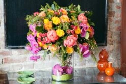 These snow-white peonies, garden roses, and medley of silver greens are sure to put you in the holiday spirit. Silver snow-flocked pinecones add an extra festive touch alongside silver decorative ornaments and dusy miller leaves. Resting within a 7 x 7″ white cylindrical vase, this arrangement stands at approximately 17” tall overall.