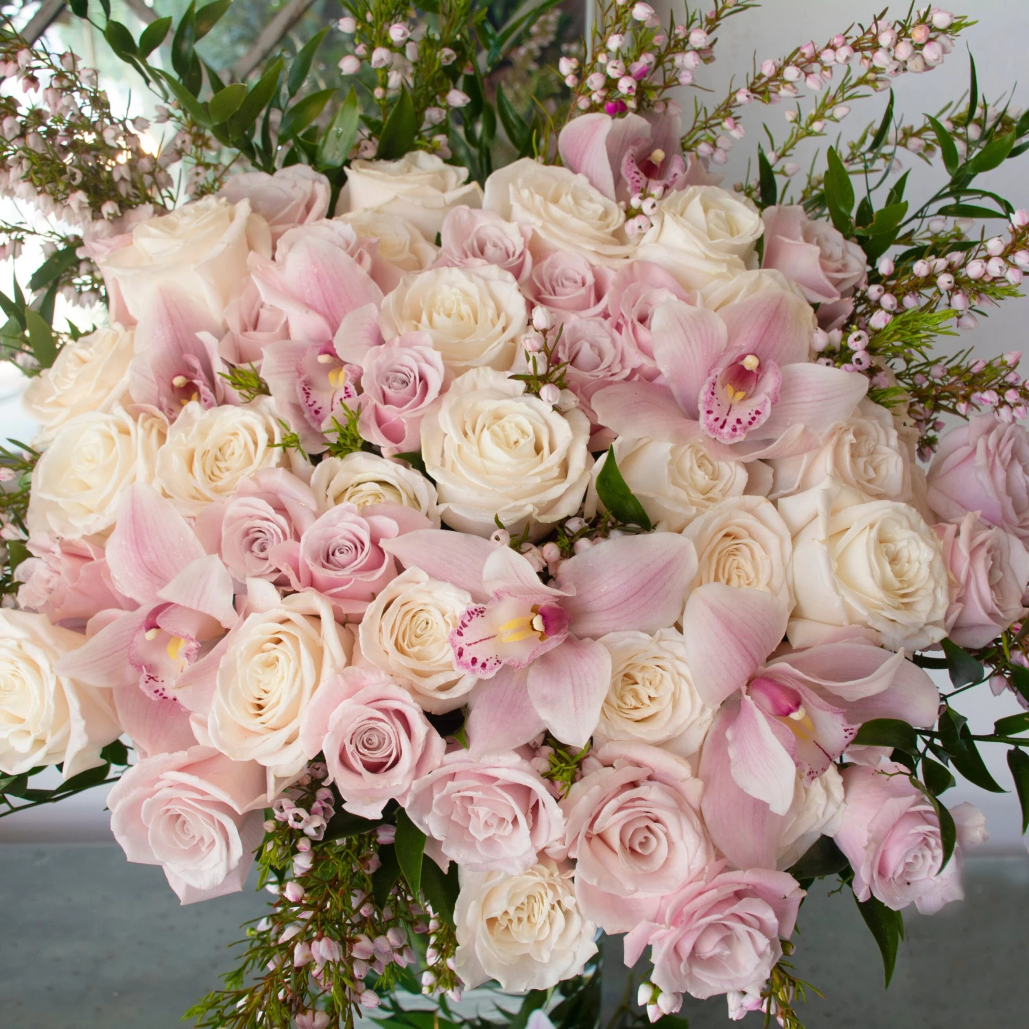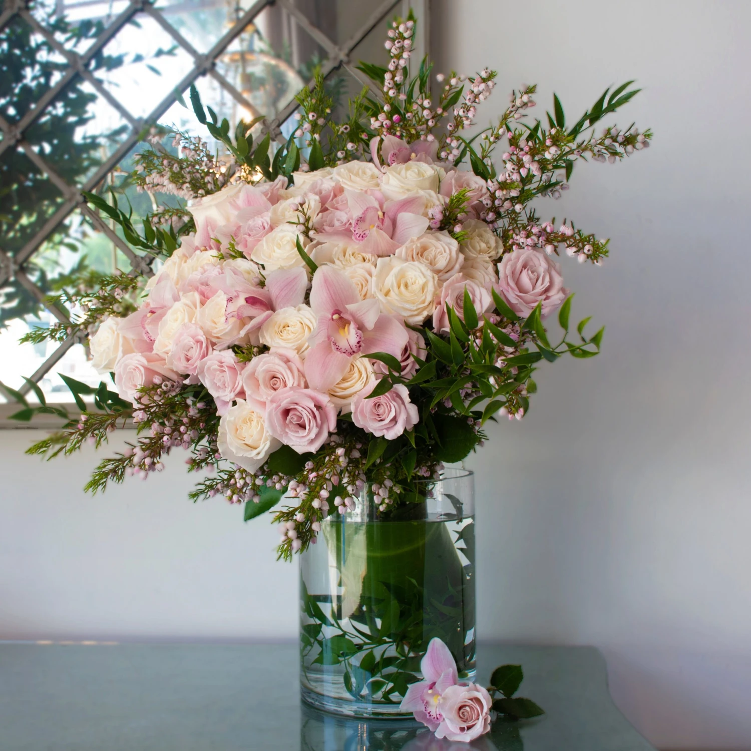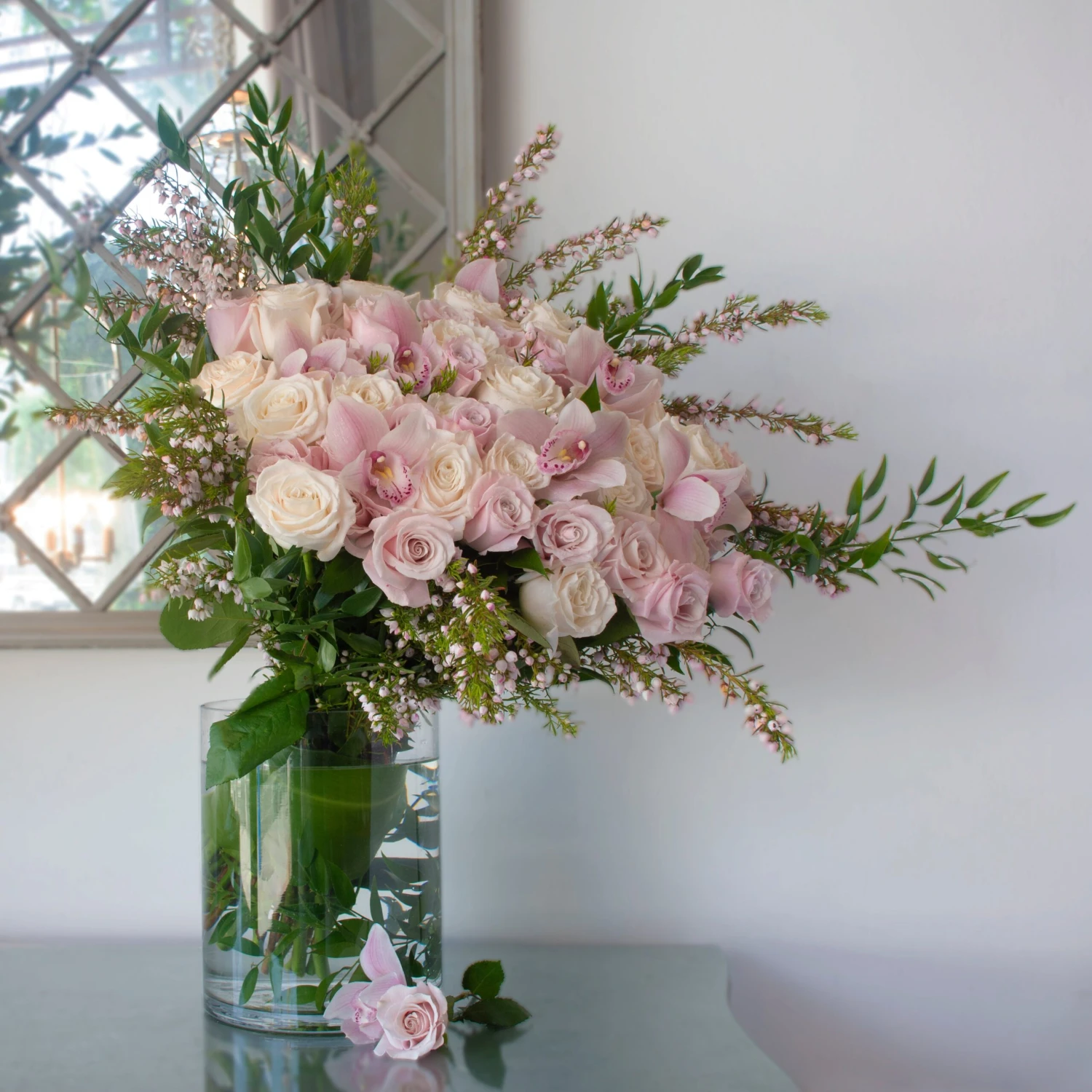 This soft and delicate arrangement is an original Empty Vase tilted display. Adorning a combination of soft pink eskimo roses, creamy playa blanca roses with just a sprinkle of pink cymbidium orchids. Pink boronia and green camellia foliage tie this arrangement together in our classic glass cylinder vase with an under water camellia leaf wrap. This dreamy arrangement is perfect for Mother’s Day, it sits at 23 inches tall and 14 inches wide.