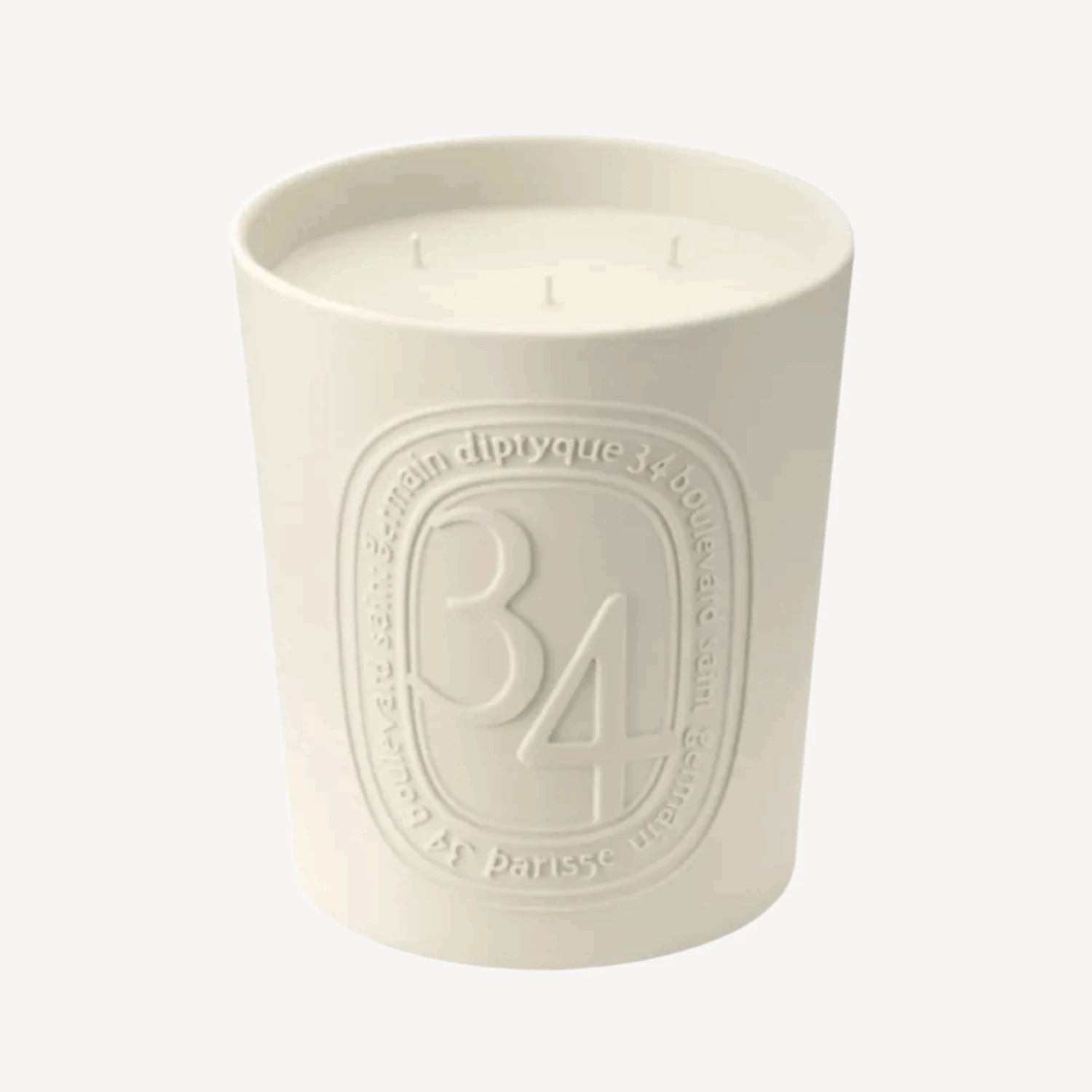 The emblematic oval of 34 Boulevard Saint Germain is engraved on a candle jar of white biscuit porcelain. Its three wicks diffuse Diptyque’s signature scent: fresh, green and distinctive notes of moss and crushed blackcurrant leaves mingling with floral notes, enhanced by spices and underscored by the richness and warmth of woods and balms.