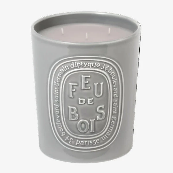 The Feu de Bois (Wood Fire) candle comes in a grey enamelled porcelain jar stamped with the diptyque oval.