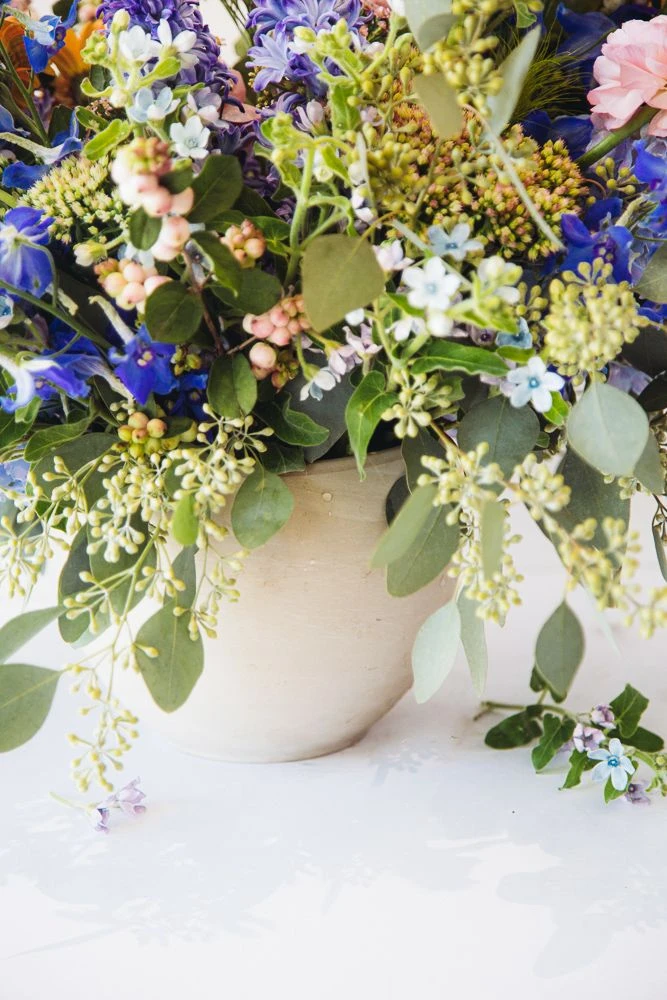 Awaken your senses with this incredible floral design. Peach daisies contrast the rich purple lilac and indigo hyacinth. Blush pink ranunculus and accents of green and soft pink blooms are placed throughout. This arrangement rests inside a rustic 10” ceramic vase.
