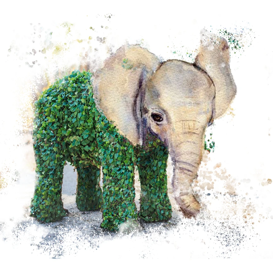Ivy Elephant topiary with built in sprinkler system. This topiary comes in various sizes including 18 inches, 24 inches, 36 inches, 48 inches, 60 inches, 72 inches, 96 inches, 120 inches, and 144 inches. Size refers to height.