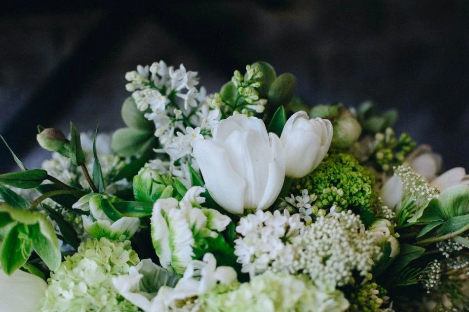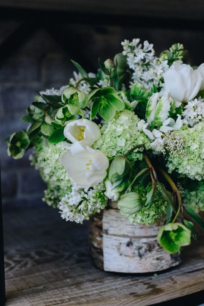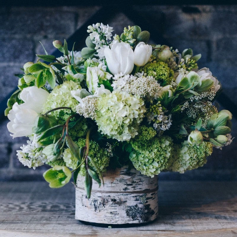 This fresh new design proves that emerald hues reign supreme. Crisp white tulips and bunches of white lilac provide a stunning contrast against vibrant lime green winter roses, rice flower, and hydrangea. Resting within a 7″ x 7″ cylinder vase lined with natural birch, this arrangement stands at approximately 18″ tall overall.