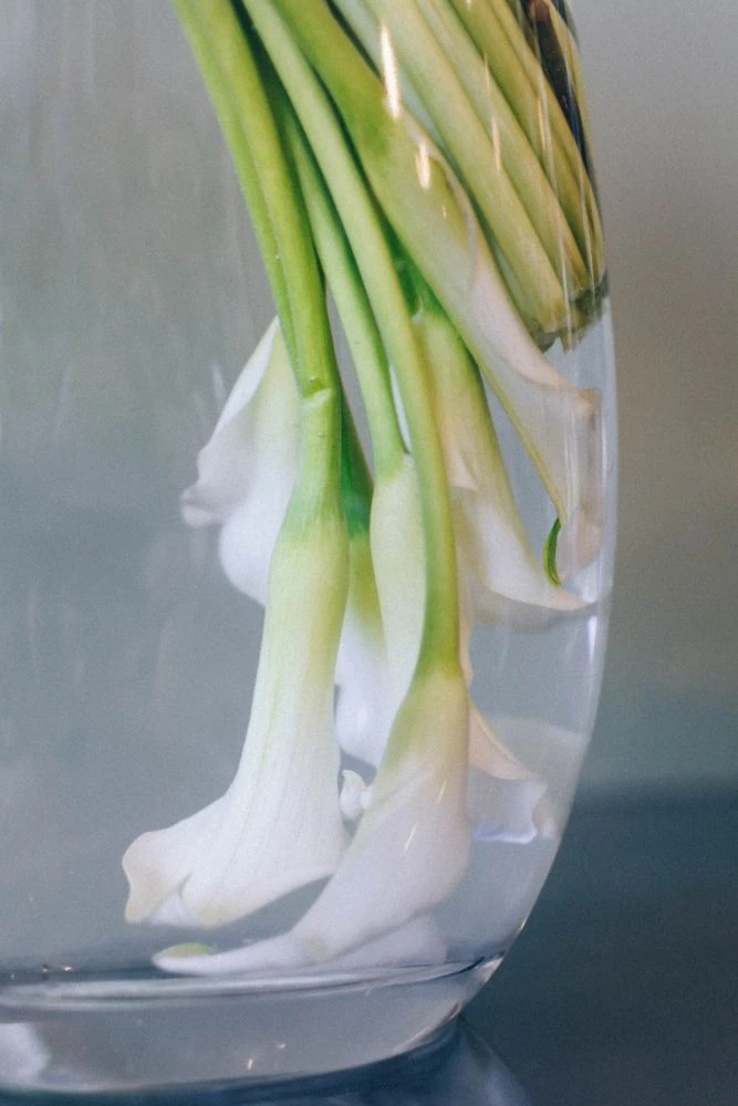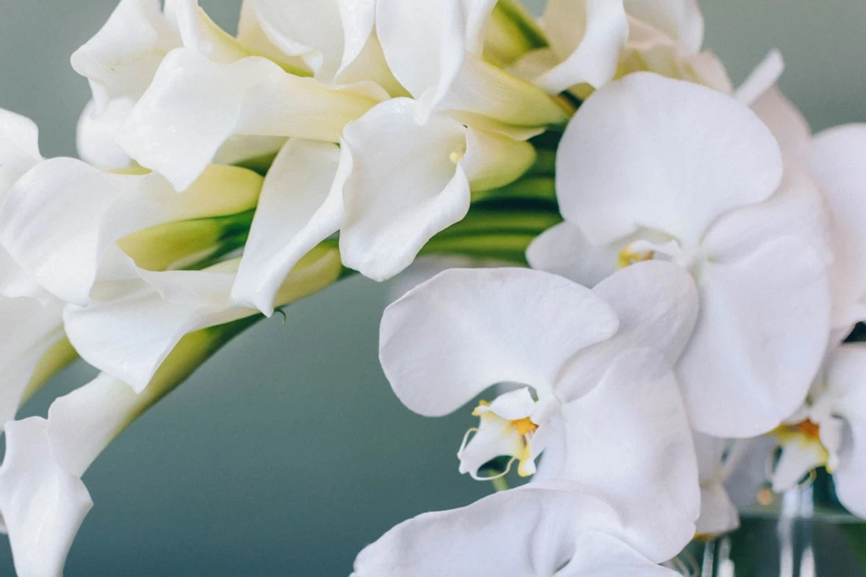 Effortlessly chic and graceful, this timeless new design defies gravity. 30 Dutch calla lilies cascade dramatically to one side, with a few visibly submerged within the glass vase. 1 stem of crisp white phalaenopsis orchid perfectly compliments the calla lilies, tying the arrangement together. This breathtaking design rests within a 12” x 5” vase and stands at approximately 18″ tall and 18″ wide overall.