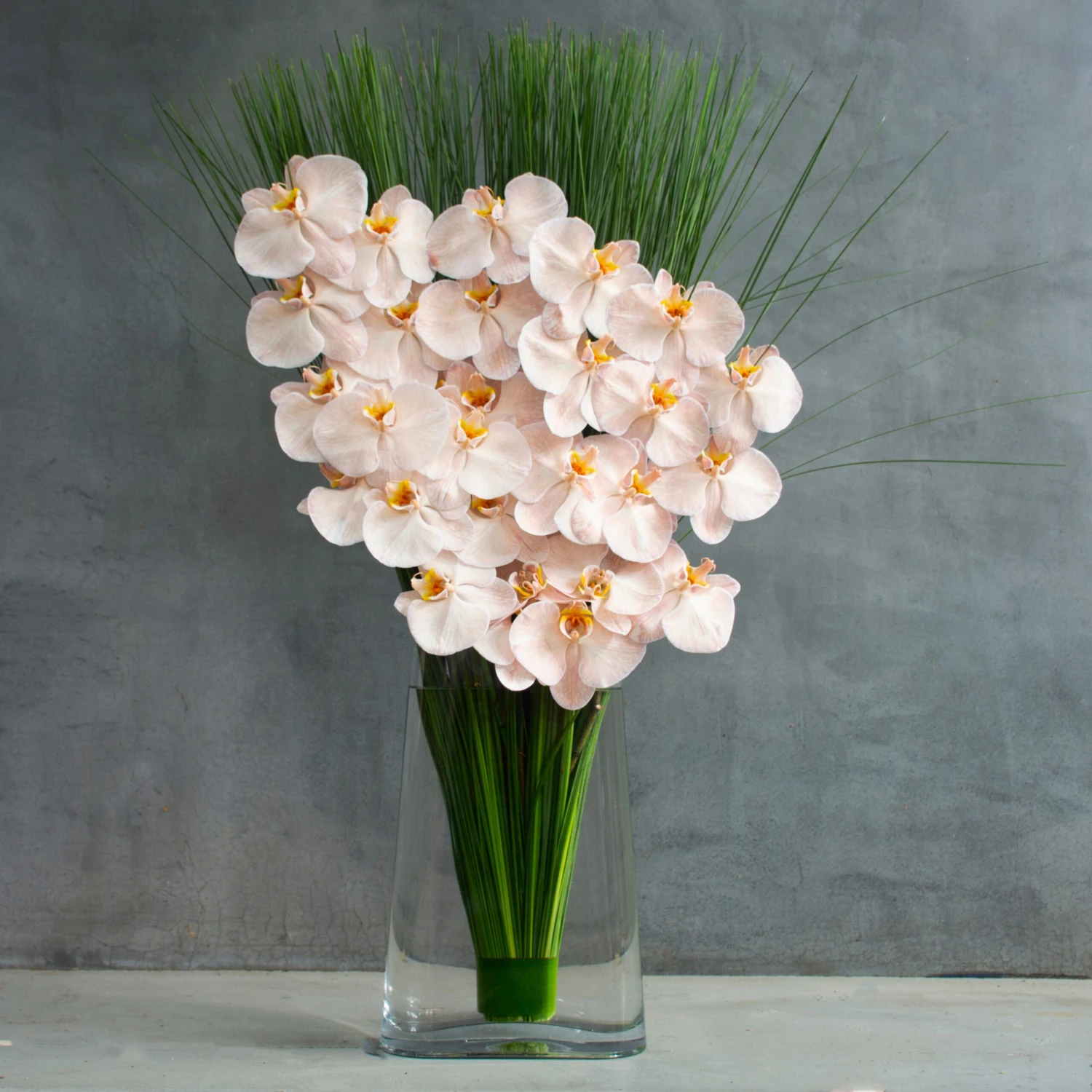 Experience the breathtaking beauty of these stunning mocha-toned Phalaenopsis orchids. Expertly arranged in an elegant espresso martini design, complemented by delicate steel grass, this exquisite floral creation is guaranteed to infuse your living space with boundless joy and radiant illumination. Delighting the senses, the arrangement gracefully rests within a spacious 13″ x 8″ vase, standing tall at 34″ and spanning an impressive width of 15″. Transform your home with this sophisticated masterpiece that epitomizes refined elegance.