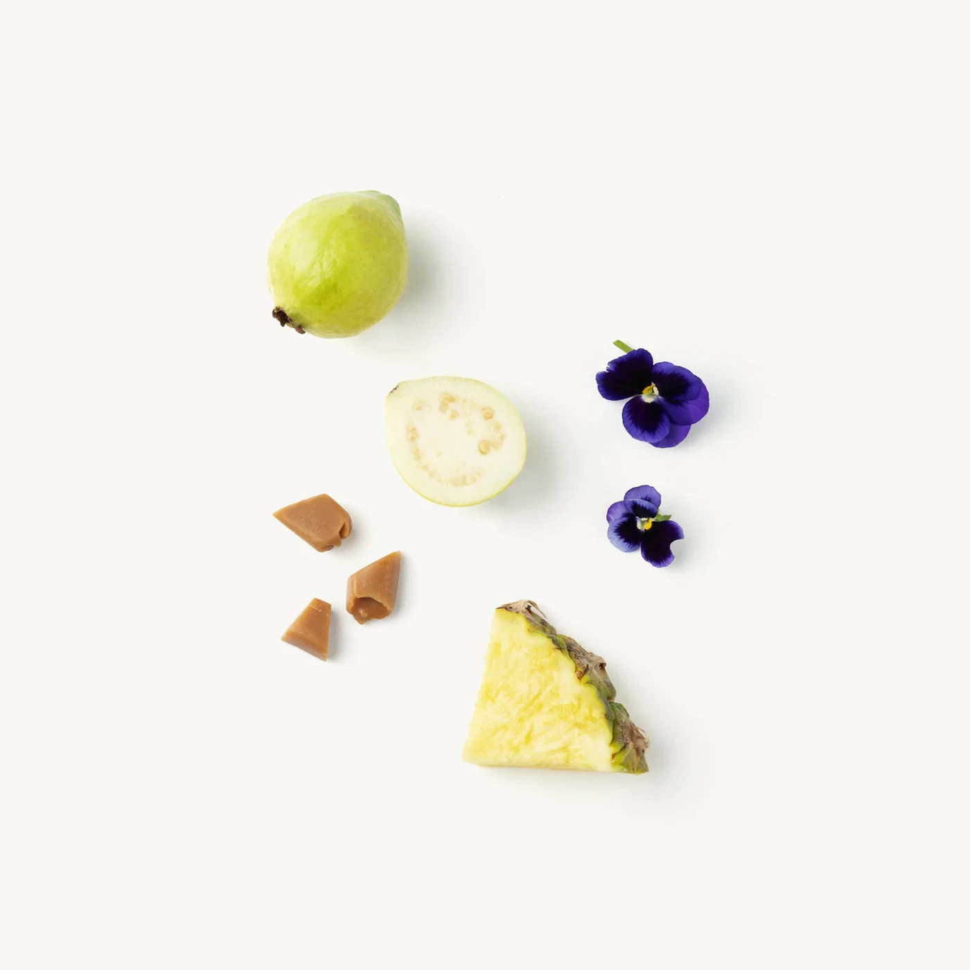 Fresh fruit and sunshine. Grounded in guava, pineapple, violet, and caramel.