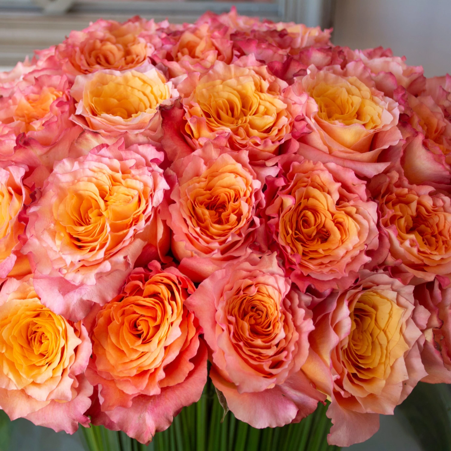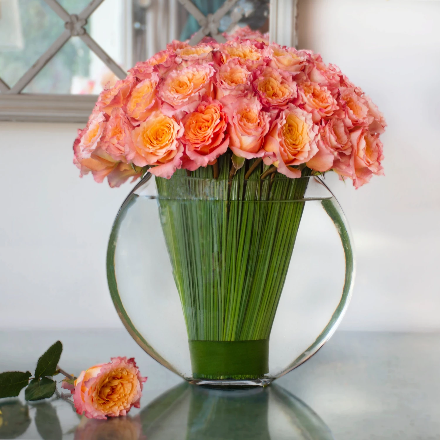 Uncover the perfect blend of timeless elegance and contemporary charm within our classic-style arrangement, showcasing a generous array of up to 50 two-toned free spirit roses. These everlasting blossoms are thoughtfully arranged in a modern fan-shaped design, gracefully cradled within a pristine fisheye vase measuring approximately 15″ x 15″. Be ready to be captivated by the effortless merging of classic beauty and modern aesthetics in this opulent floral masterpiece.