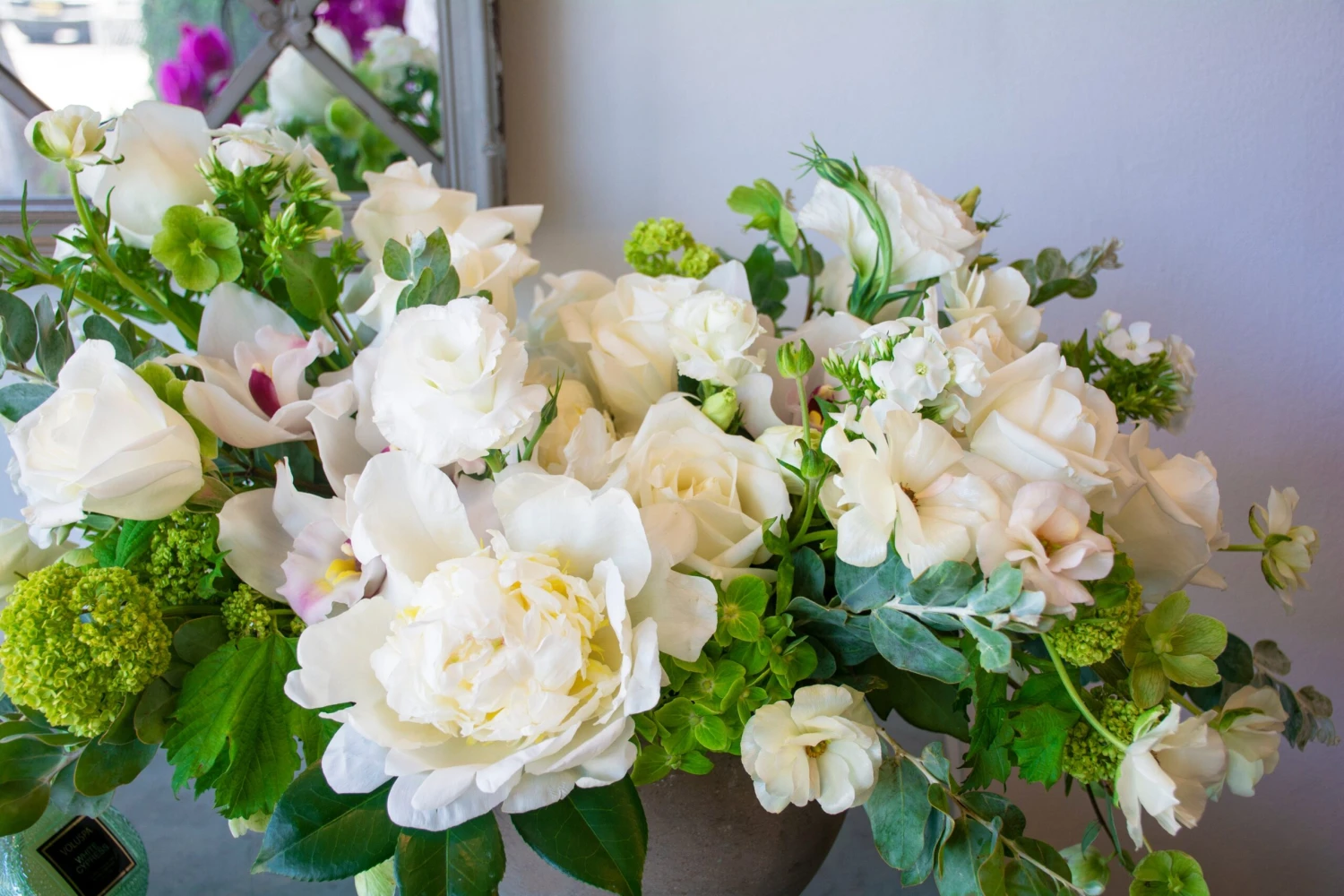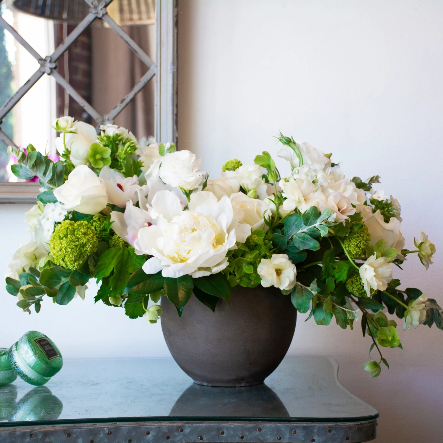 Whites & Greens – a classic. White lisianthus, peonies, and winter roses are complimented by garden-fresh eucalyptus, bouvardia, camellia foliage, and hydrangea. Spilling out of a 6″ tall grey clay, round pot – this gorgeous arrangement will all life to any home.