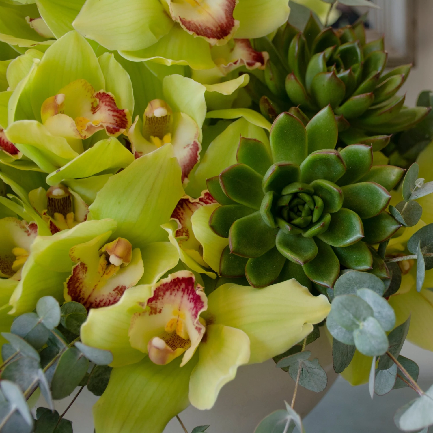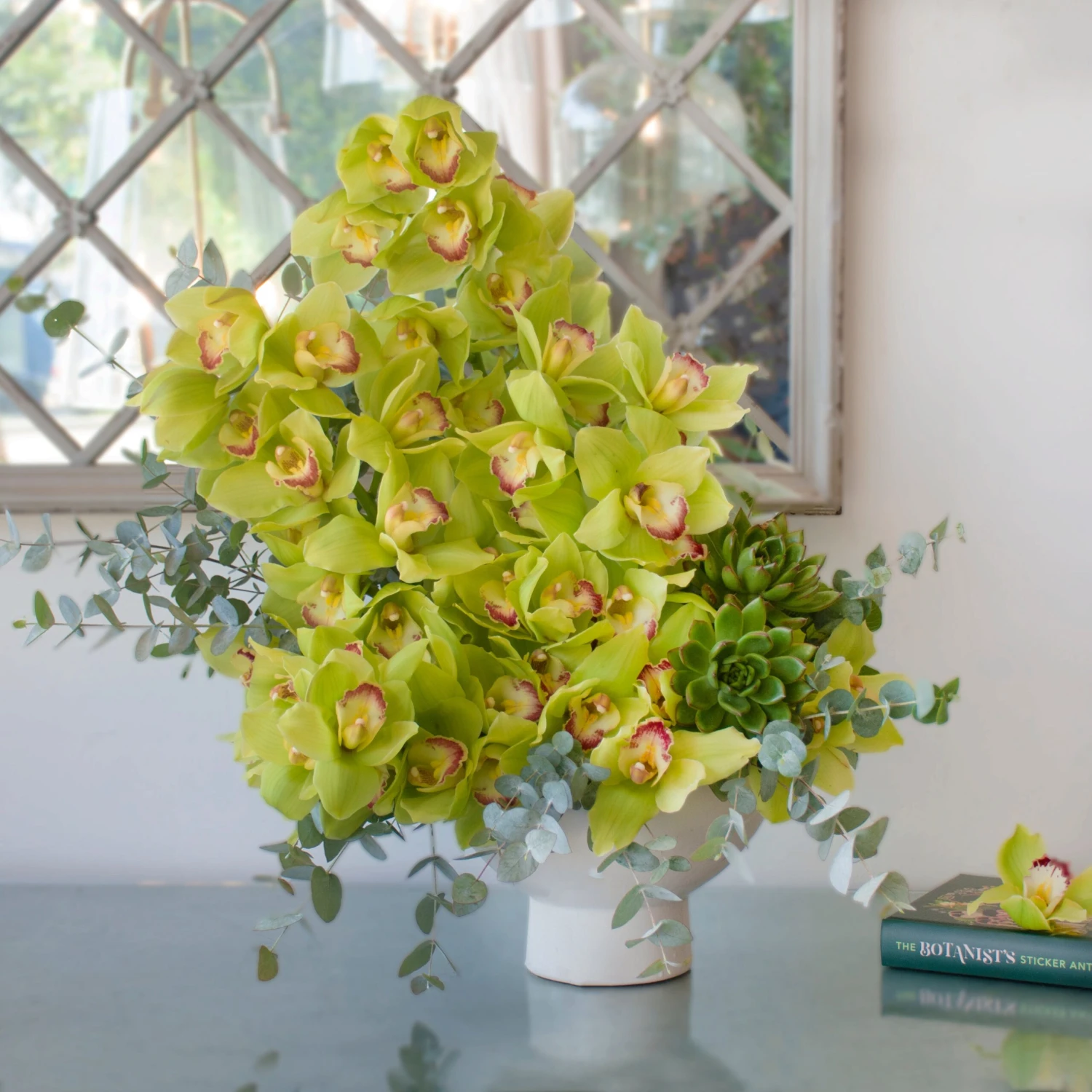 Lush green cymbidiums stand tall, elegantly inclined towards the heavens. From the base of the pristine white pedestal vase, vibrant eucalyptus branches extend gracefully, while two verdant succulents nestle at the base. This captivating composition measures 21 inches in height and spans 18 inches in width.