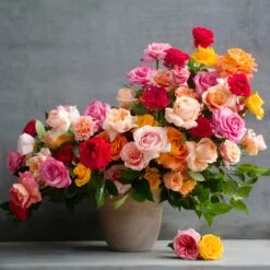 Our timeless rose garden is designed with a mixture of regular and garden roses. The garden rose selection includes the uniquely textured Ruffled Princess Crown, the gradient-toned Mayra’s Peach, the soft and creamy Ohara, the vibrant Mayra’s Rose Bright, as well as classic yellow roses and blooming shimmering roses. This opulent composition stands at a height of 26 inches and spans 29 inches in width.
