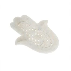 Hand-carved from natural Jaipur white marble, this delicate marble Hamsa Hand soap dish makes a beautiful and unique bathroom accessory.Â