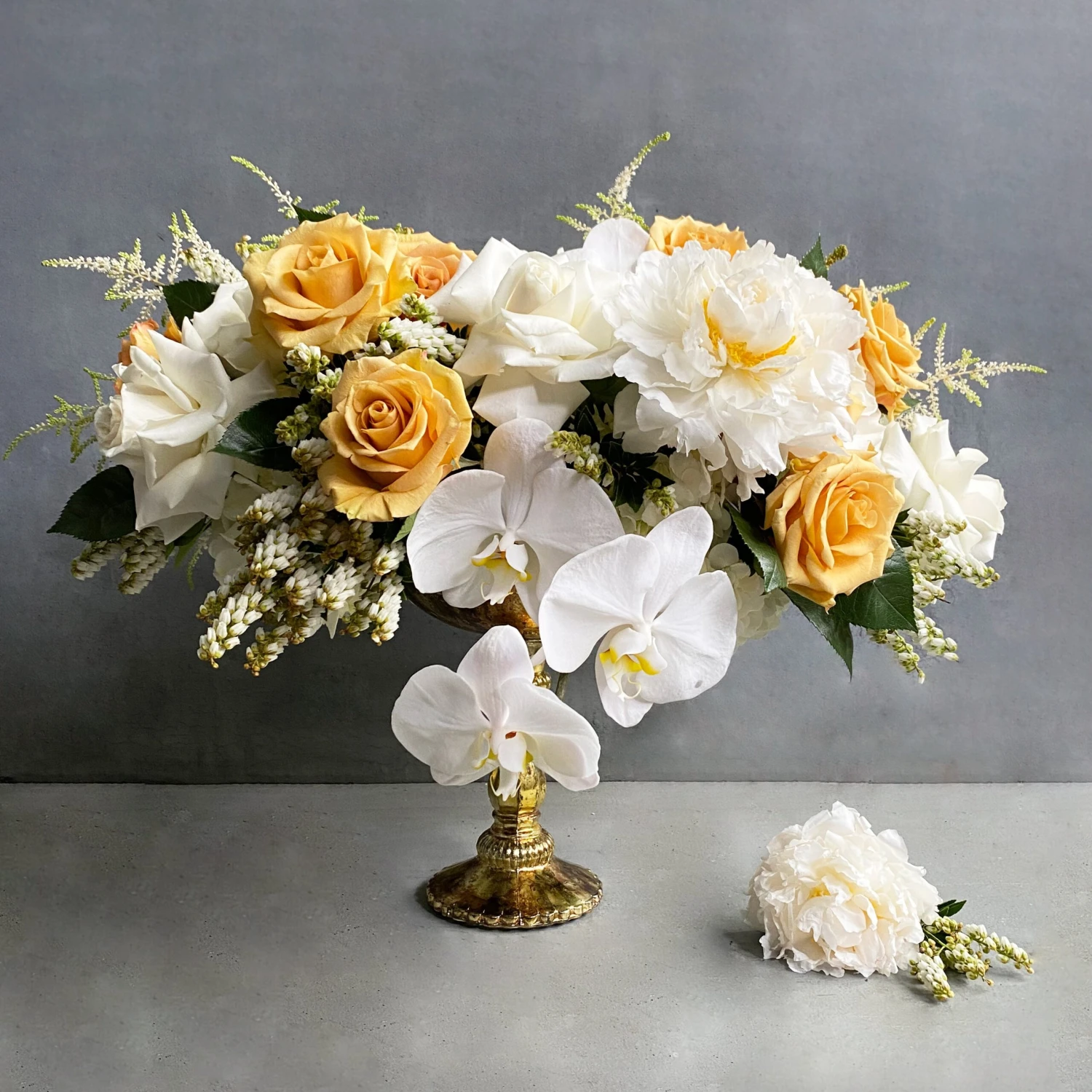This arrangement is the epitome of elegance and grace. Roses, phalaenopsis orchids, and peonies blend harmoniously with accents of astilbe and white hydrangea. Perfect to decorate your home or to send as a gift.