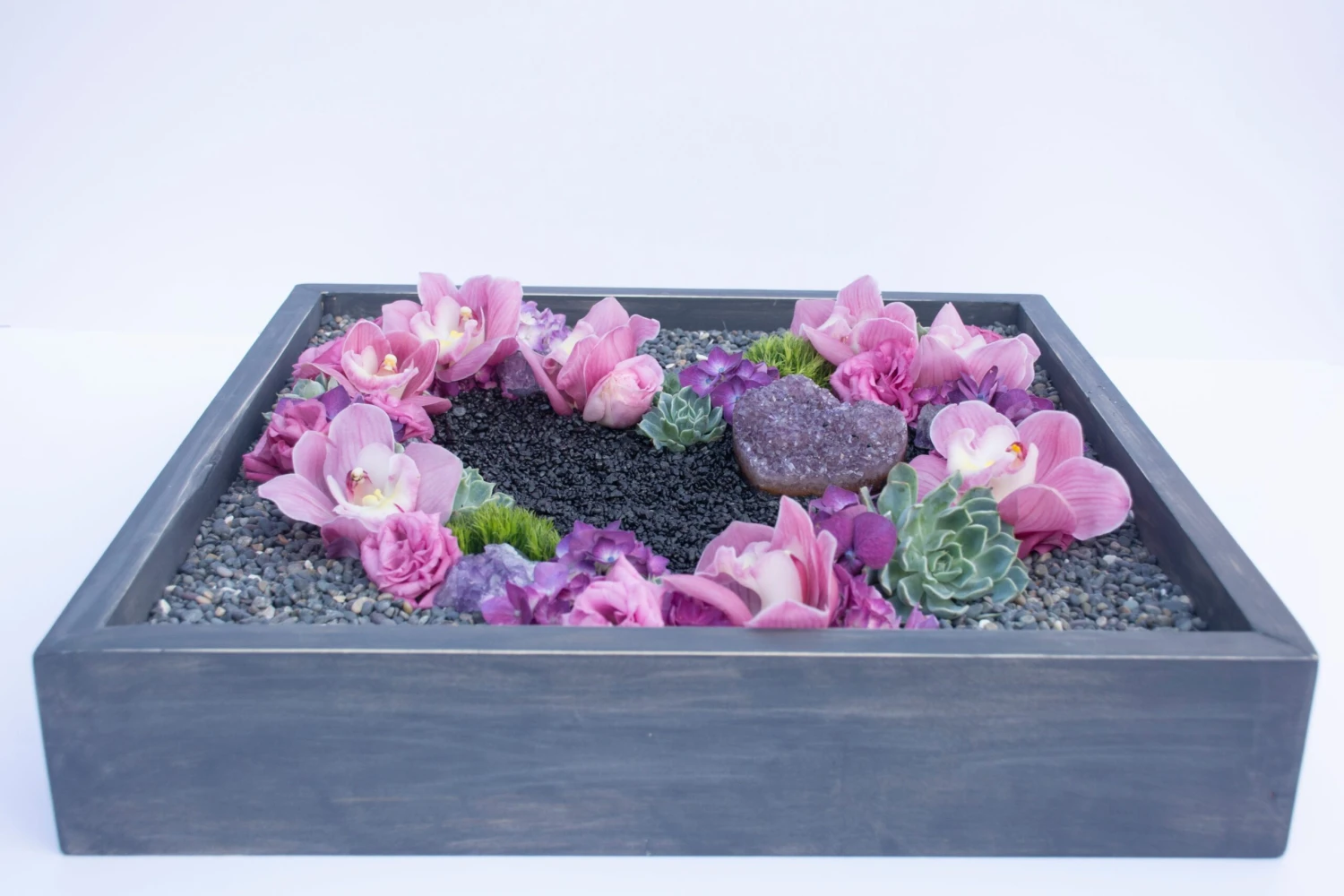 Hues of lilac, lavender and amethyst florals paired with green baby succulents, moss and amethyst crystals are perfectly shaped into a heart. An amethyst crystal heart lays artfully inside the floral heart on black gravel. The floral and crystal heart are placed in a gray washed wooden box 18″ x 18″ with gray gravel surrounding the heart.