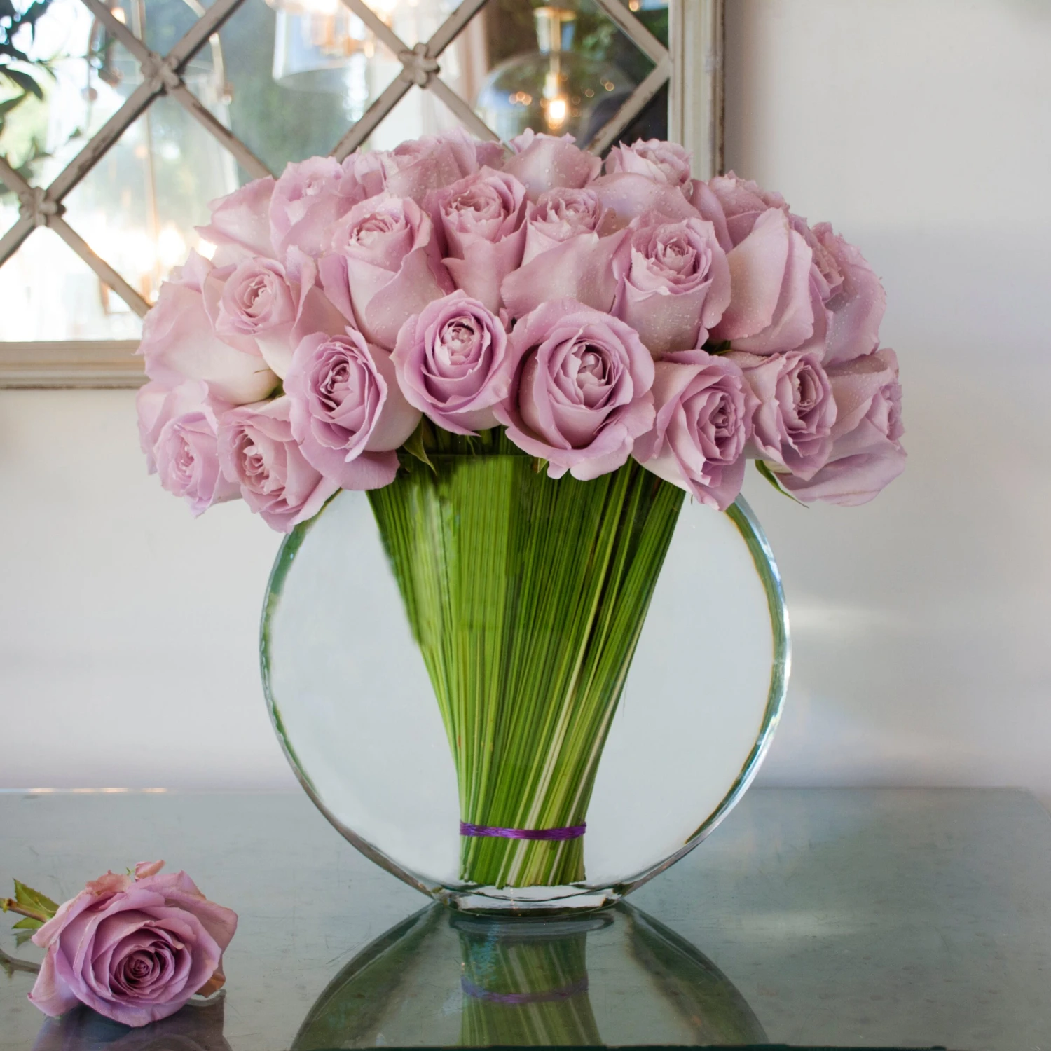 Our exquisite fusion of timeless elegance and contemporary aesthetics. Experience the perfect blend of classic beauty and modern design as up to 50 delicate lavender roses gracefully arranged in a contemporary fan shape, nestle within a crystal-clear fisheye vase. Standing tall at 10 inches and measuring approximately 15″ x 15″ in total, this luxurious floral arrangement will captivate your senses.