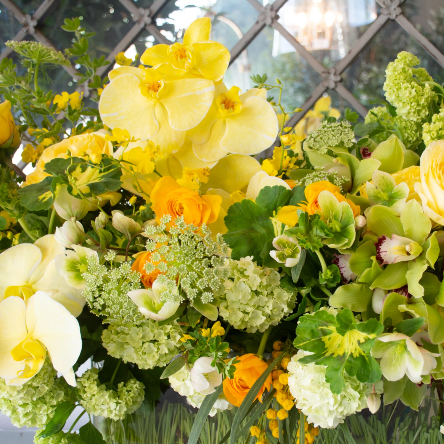This lush garden arrangement boasts with a beam of sunshine! This arrangement consists of a beautiful mix of vibrant yellow garden roses, sunny phalaenopsis orchids, fiery ranunculus, and cymbidium orchids, all surrounded by a variety of green foliage. Measuring 18 inches high and 23 inches wide, this arrangement is presented in a clear glass vase, which is lined with wheatgrass to create a meadow-inspired aesthetic on a bright sunny day.