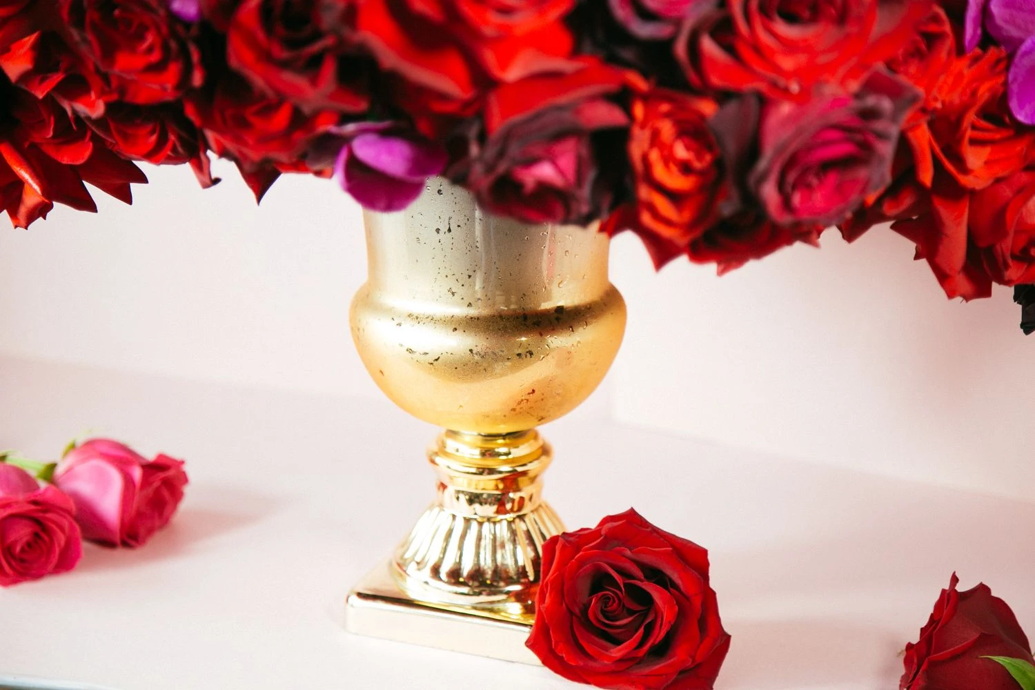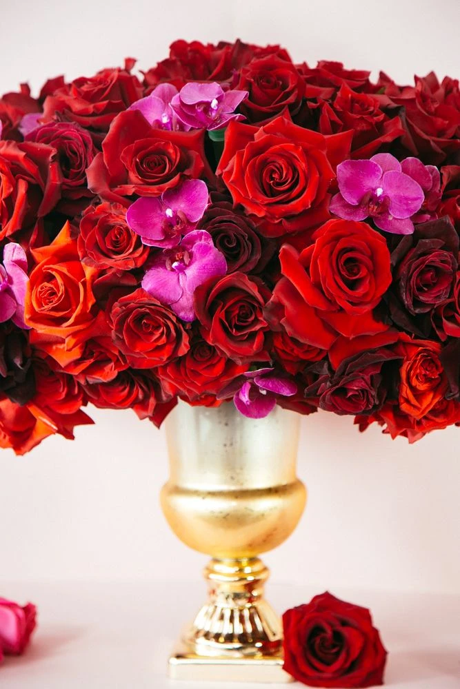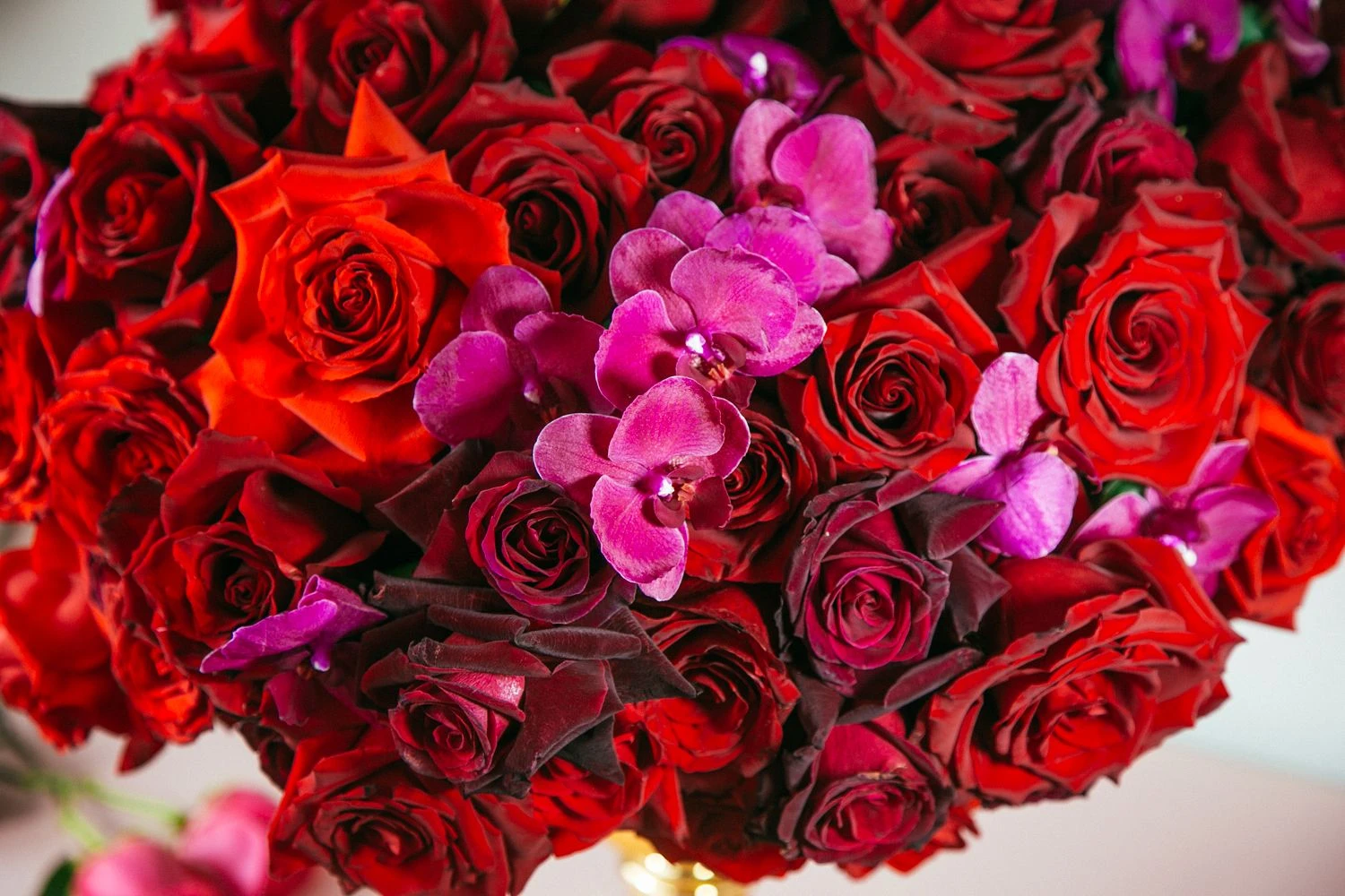 Take in the beauty and splendor of up to 100 perfect red roses in this stunning floral arrangement. Vibrant purple cymbidium orchids are delicately placed throughout, contrasting the various hues of red emitted from the roses. Resting inside a gold 12” tall vase, overall this arrangement stands around 24” tall and 27” wide.