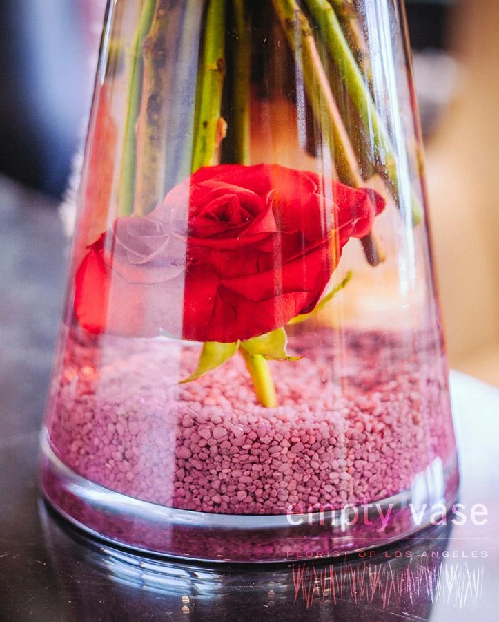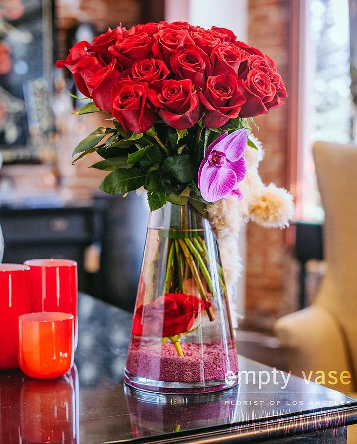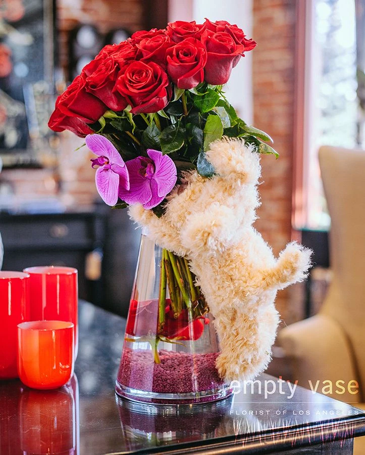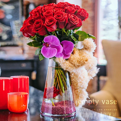 What could be a sweeter show of affection than this charming arrangement? Keeping within tradition, we have selected 25 beautiful long-stem red roses, and paired them with orchids for an unexpected pop of color. The bouquet rests in a tapered glass vase with decorative gravel and a submerged rose. Included with the arrangement is a darling plush puppy. This arrangement is approx. 24″ tall. (Please note: If plush puppy is sold out, we will substitute similar plush animal.)