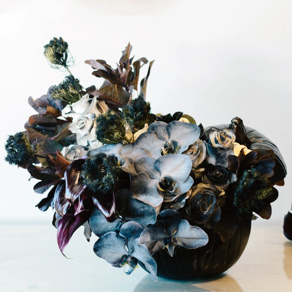 A hand-painted pumpkin, as black as night, overflows with fall leaves, variegated indigo orchids, and dark purple calla lilies. Crisp white roses are spray painted black to match the spooky succulents. Miniature white pumpkins rest atop adding a splash of light. This arrangement stands at approximately 15″ tall.