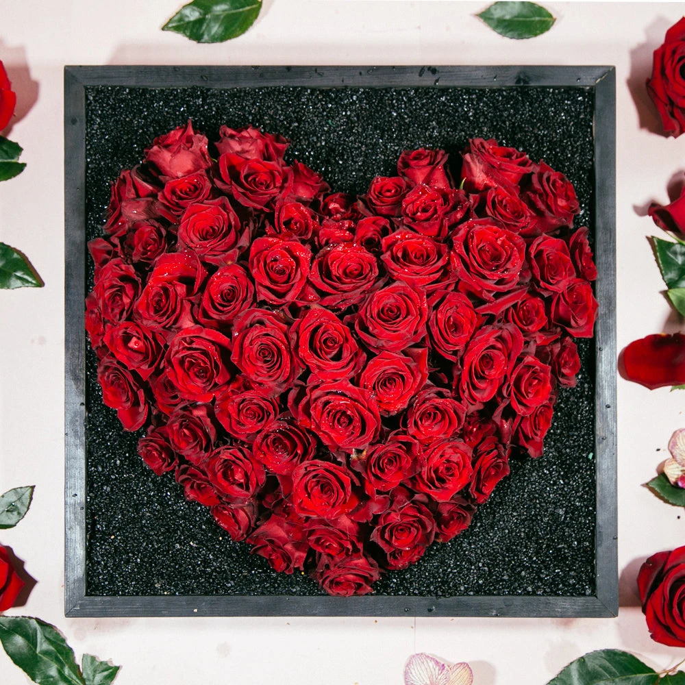 Feel the power of love with this stunning floral box design. Up to 50 red roses are shaped into the perfect 3D heart. Resting atop a bed of black rocks, two stunning cymbidium orchids accent one corner. Resting inside a 20” by 20” hand-made wooden box, overall this arrangement stands around 6” tall.