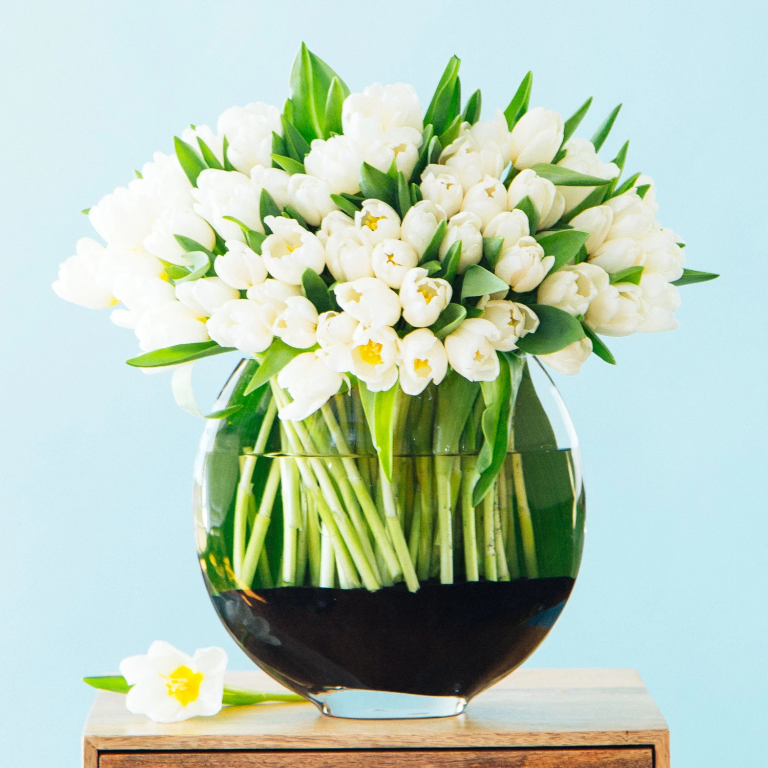 Crisp white tulips are shaped into a beautiful crescent ark, with up to 60Â lush green stems rooted in midnight black sand. This beautiful floral design rests within a 10″ tall glass fish-eye bowl. Overall, this stunning arrangement stands at approximately 18″ tall overall.