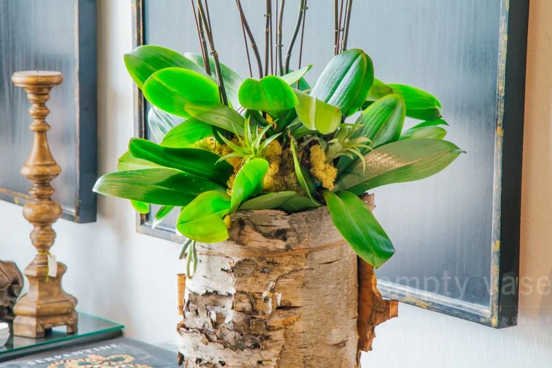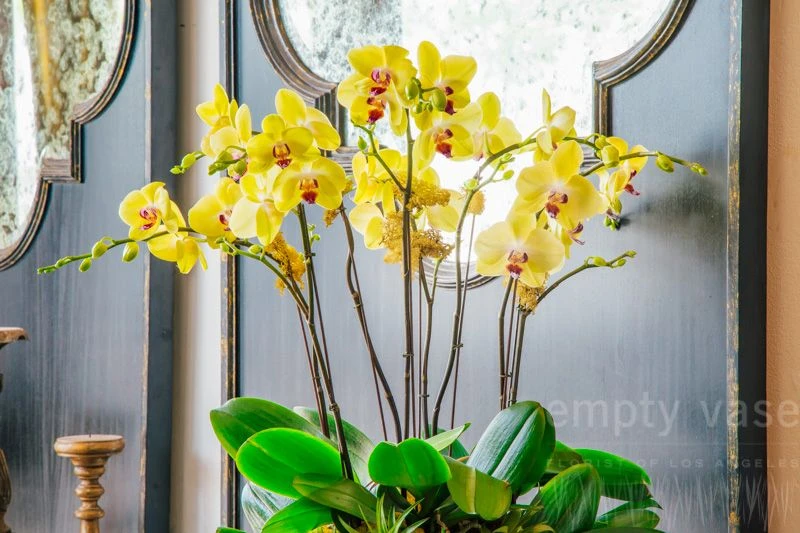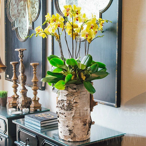 Yellow marks the color of happiness, and this beautiful floral design boasts not only the feelings of joy, but also carries a decadent and creative beauty. Over 6 bright yellow cymbidium orchids tower towards the sky, with accents of yellow moss scattered at the base of the orchids. Rustic Birchwood lines the exterior of the 18” by 9” glass vase to complete the look. This arrangement stands 41” tall and 27” wide.