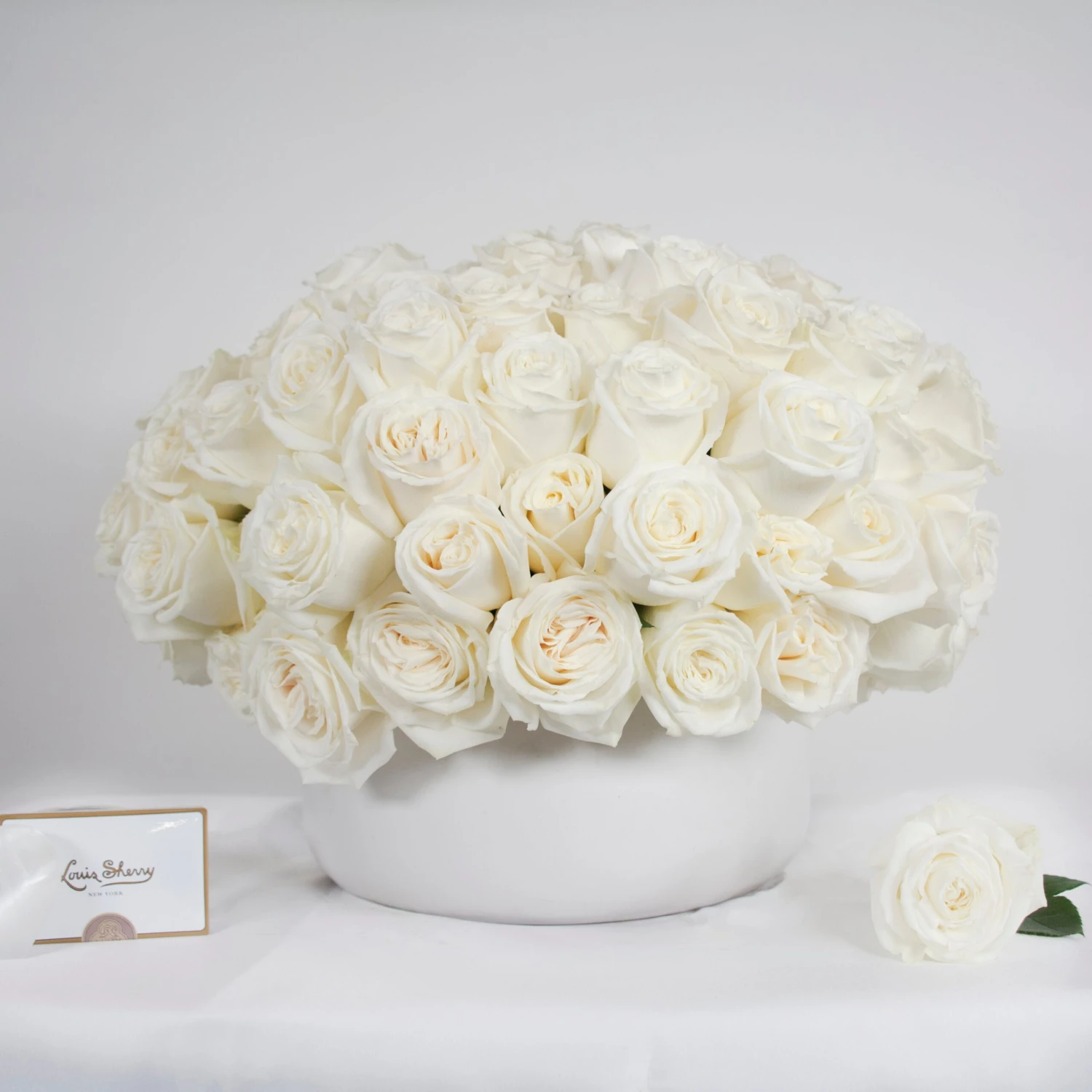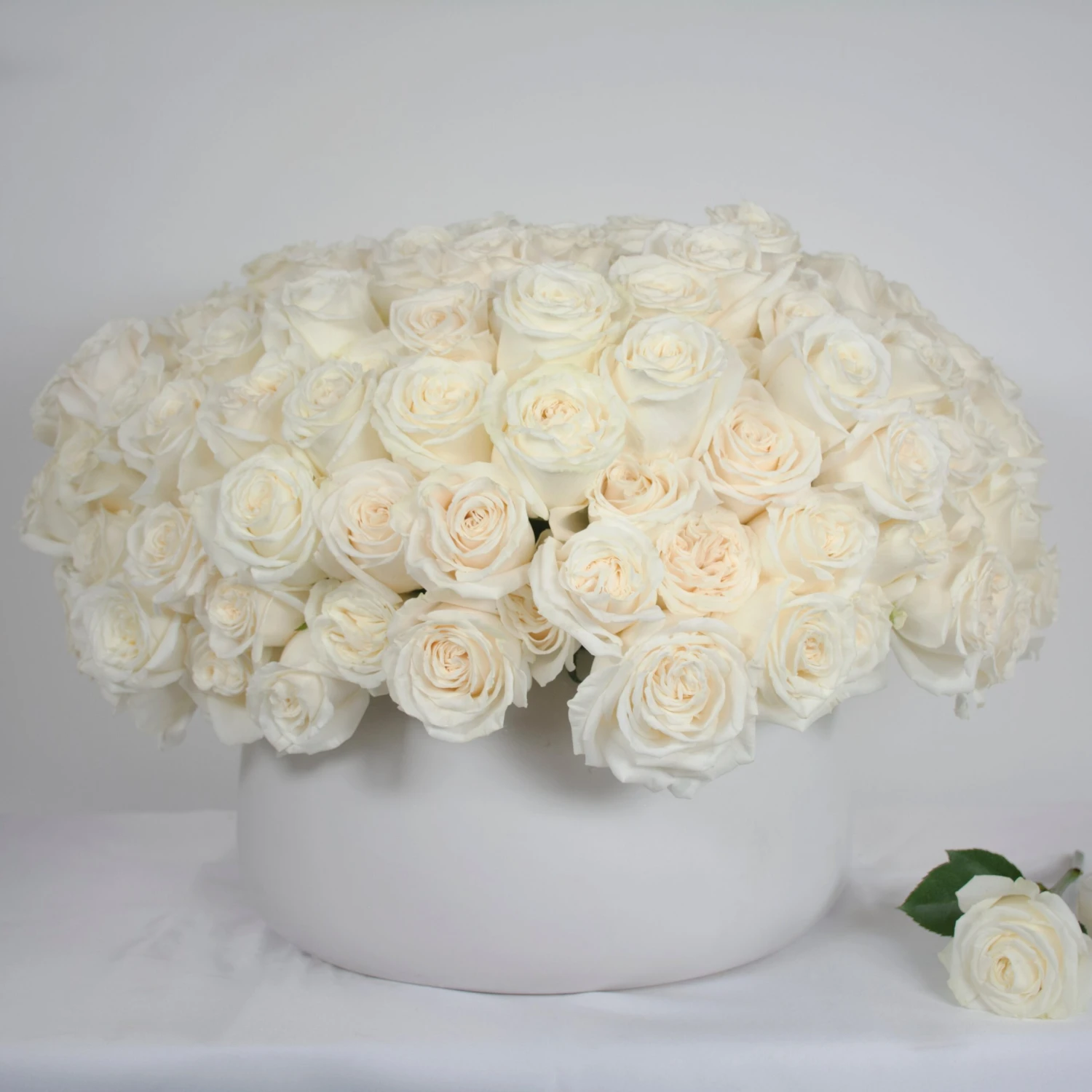 Medium: This elegant arrangement of One Hundred romantic white roses artfully placed in a dome shape sits in a white ceramic bowl. With a complete 360 view this arrangement sits at 12 inches tall and 17 inches wide.