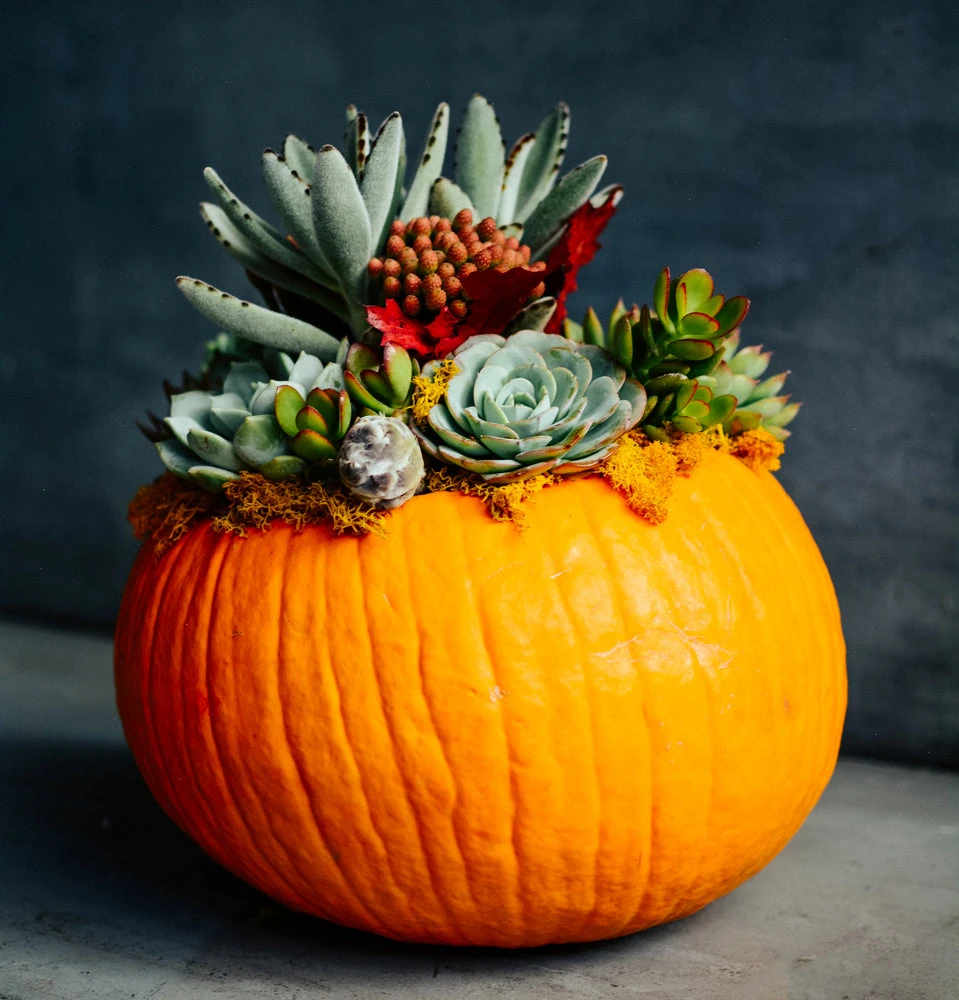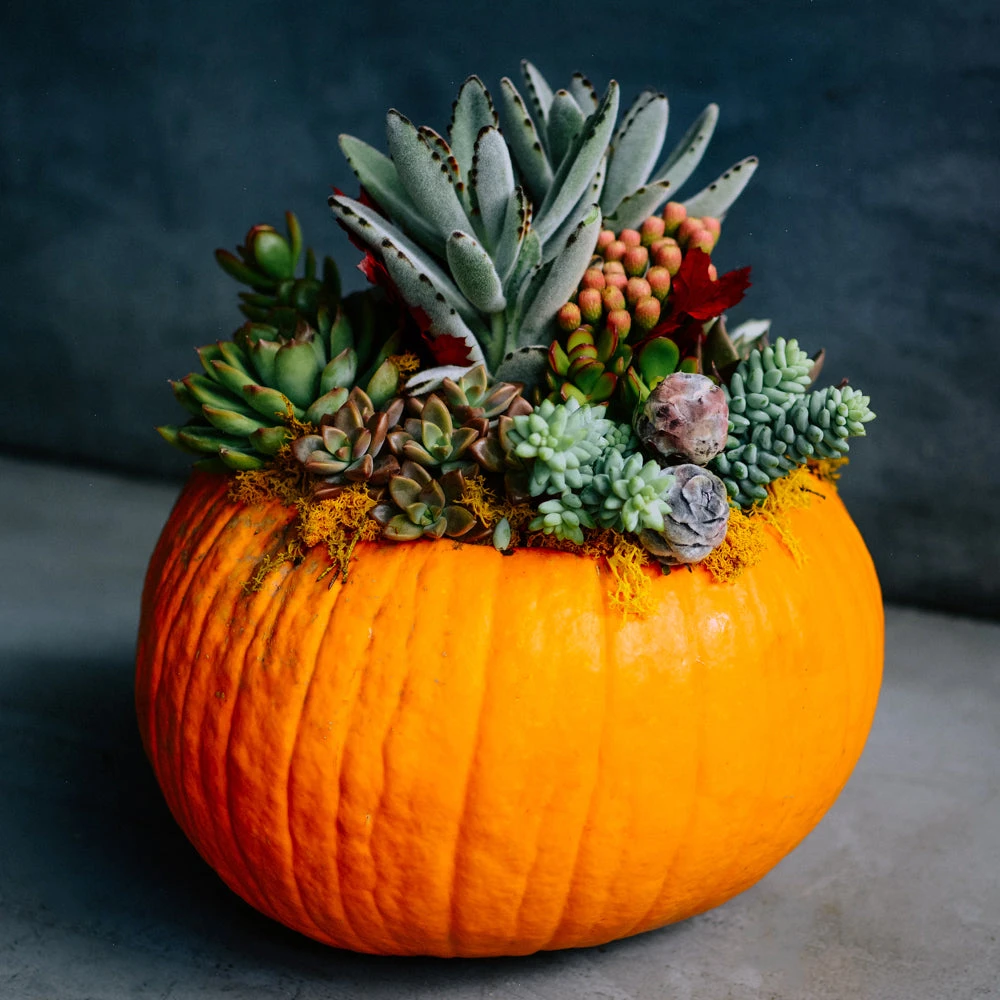 A decadent seasonal display, this autumnal design captures the spirit of Halloween in Southern California. A fresh yellow pumpkin is hollowed out and filled with a vibrant bouquet of hand-selected succulents, fall leaves, and reindeer moss. This arrangement is approximately 12″-14″ tall — please note that pumpkins will vary slightly in size and will decompose over time.