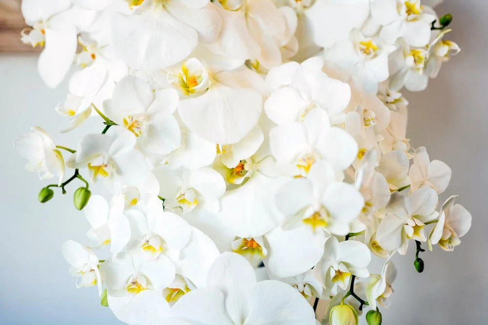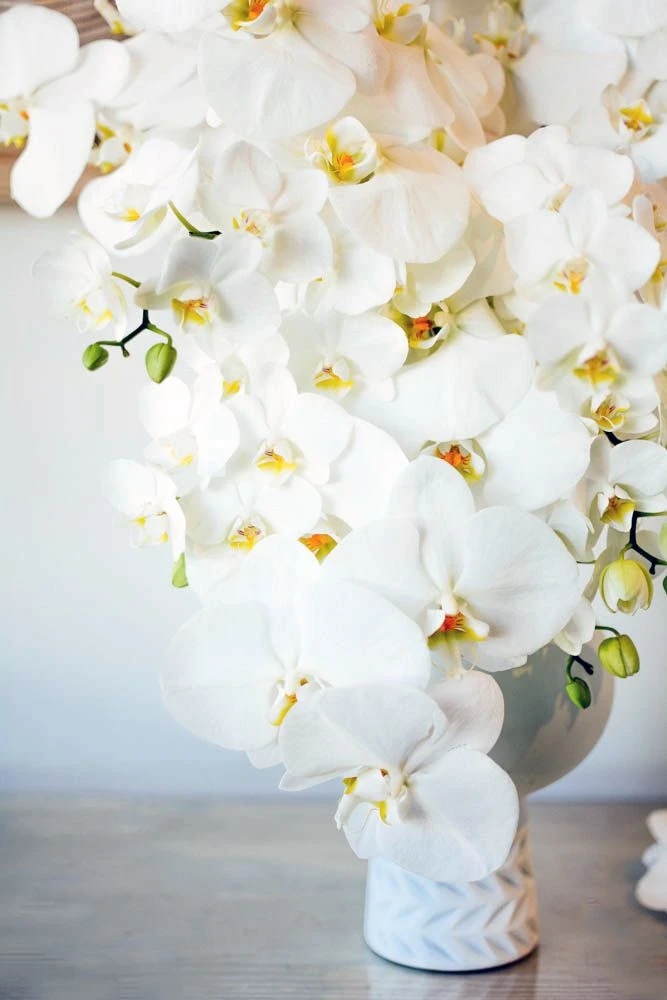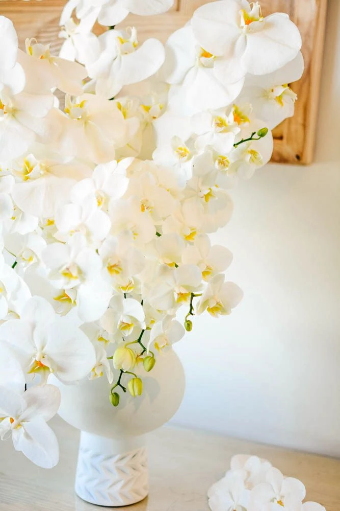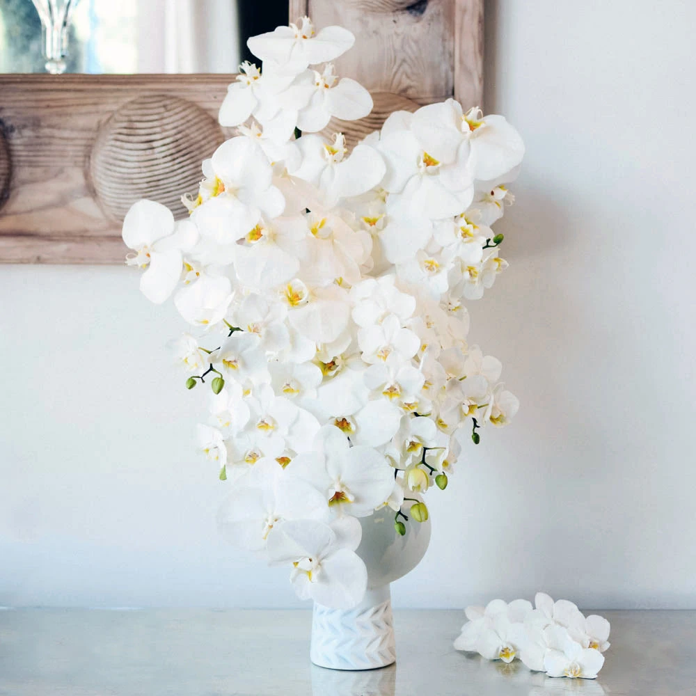 This monochromatic floral design features a a chic tower of cut phalaenopsis orchids and miniature phalaenopsis orchids. White orchids have long symbolized elegance and beauty, and this structural arrangement is no exception! Standing tall from within a 12″ tall white designer vase, “Orchid Ikebana” measures approximately 29″ tall overall.