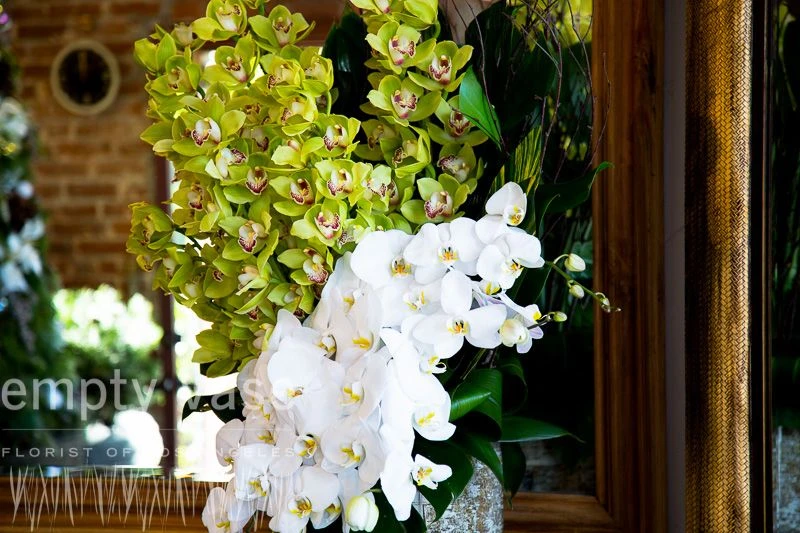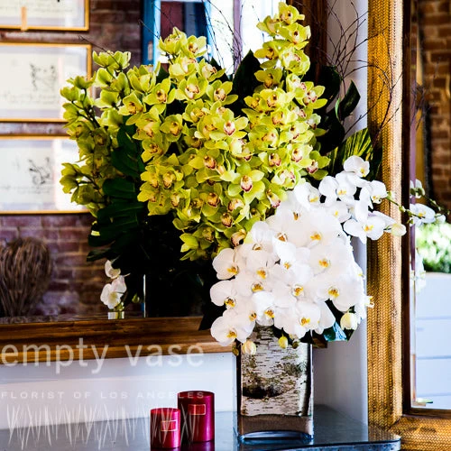 As the first sun of the morning begins to set upon a dewy grass field, springβs sweet promise begins to show its first signs of return. This lavish floral design is sure to sweep anyone off of his or her feet. Cymbidium and phalaenopsis orchids gracefully tower towards the sky, as ti leaves and victoria branches gracefully sit behind. This arrangement sits in a 16β glass rectangle vase lined with birch wood, with the overall arrangement standing 36β tall.